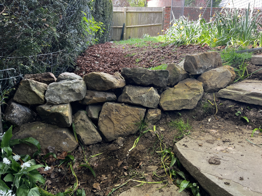Dear All, I build a wall with rocks to retain the soil and bark behind it. Is there anything i can do to make it more secure? Have some soil in between the rocks maybe?