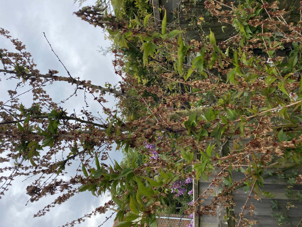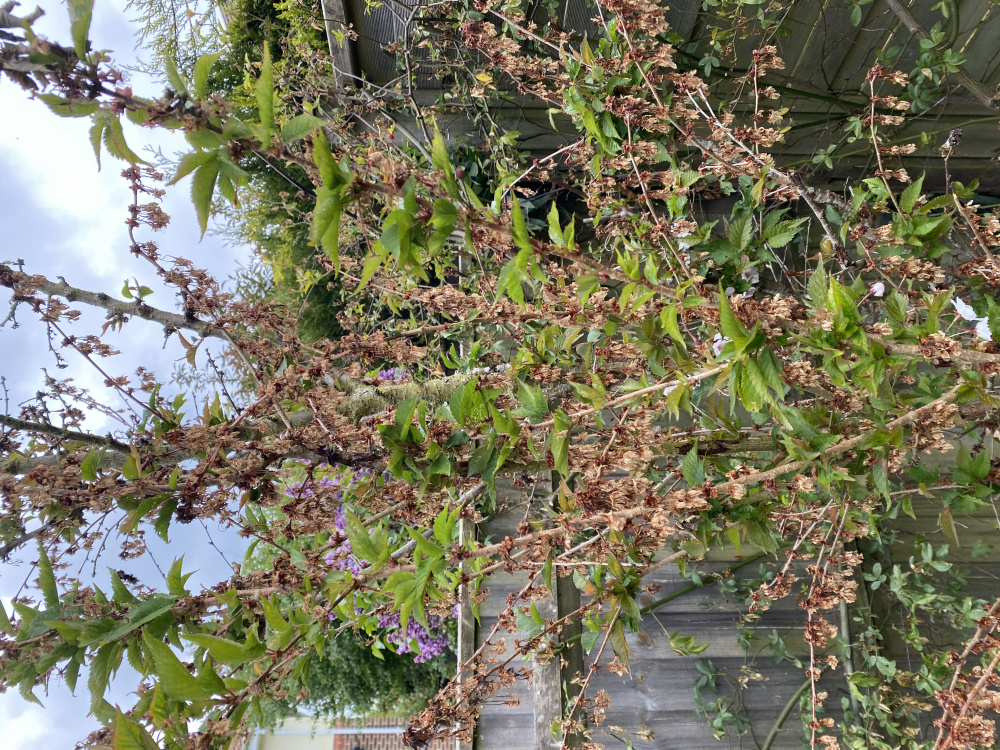 It looks to me like the brown bits are where it's either been caught by frost or scorched by strong winds and the green leaves are new growth.