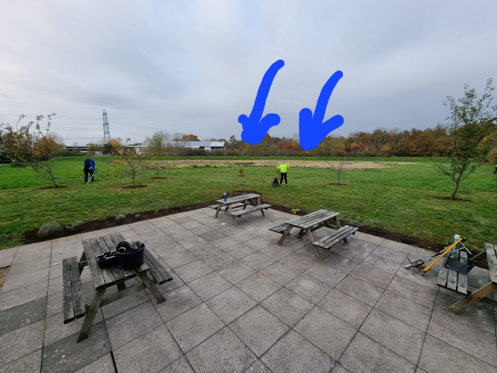 I'm working in a little patch at work, bit of an old photo this one, but there's two old fruit trees that snapped, where the arrows point, but have grown back small branches.