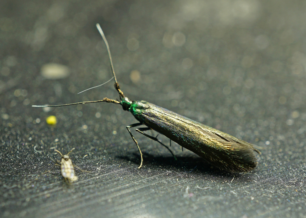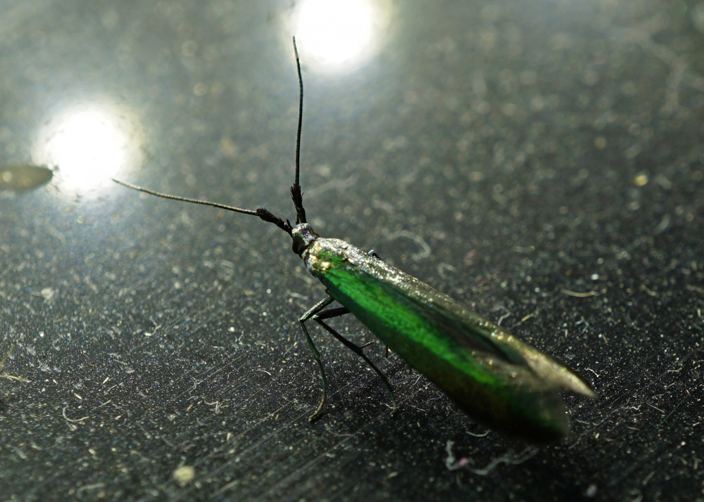 This is part of my no-mow wild edge to the 'lawn'. I'm not sure I can call it a lawn really as it doesn't fit the job description. This weather is great for ripening grass seed and the sparrows have been having a good old feed of seed this morning. Lots of happy bees and I'm trapping some interesting moths that rely on white clover for their life cycle. The shimmering green metallic wonder that is the Meadow Case-Bearer (photo below) is one example. Related to the Case-Bearing Clothes Moth but not interested in eating your woolly socks.