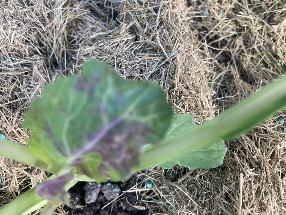 We put in many very healthy looking brassicas.They took very well,but over the last week or so,some of them have developed a reddish purple patch.Not all plants are affected and not all leaves on the affected plant are involved.I did wonder if the very cold snap shortly after they went in could have caused it. Have any of you ever seen this ?
