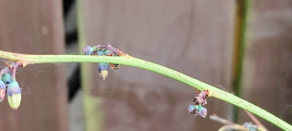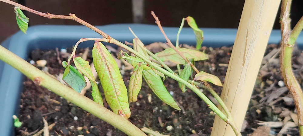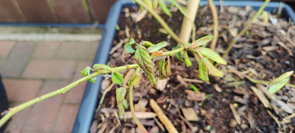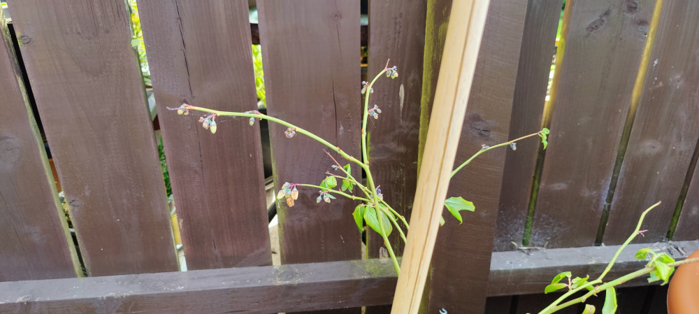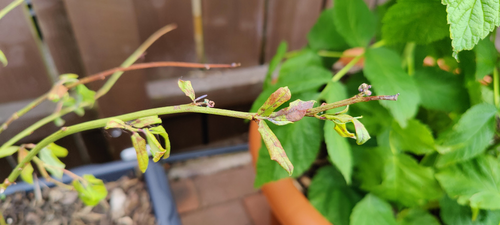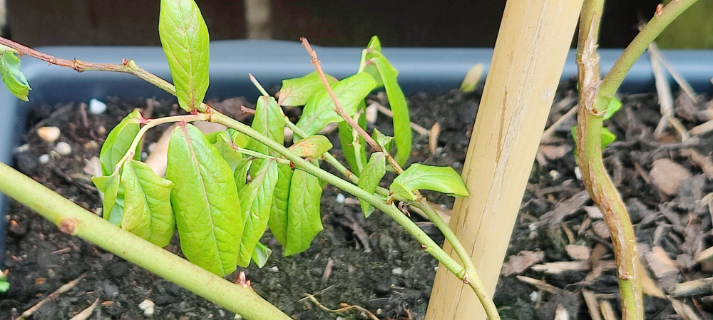 Weak growth on one of the potted blueberries.