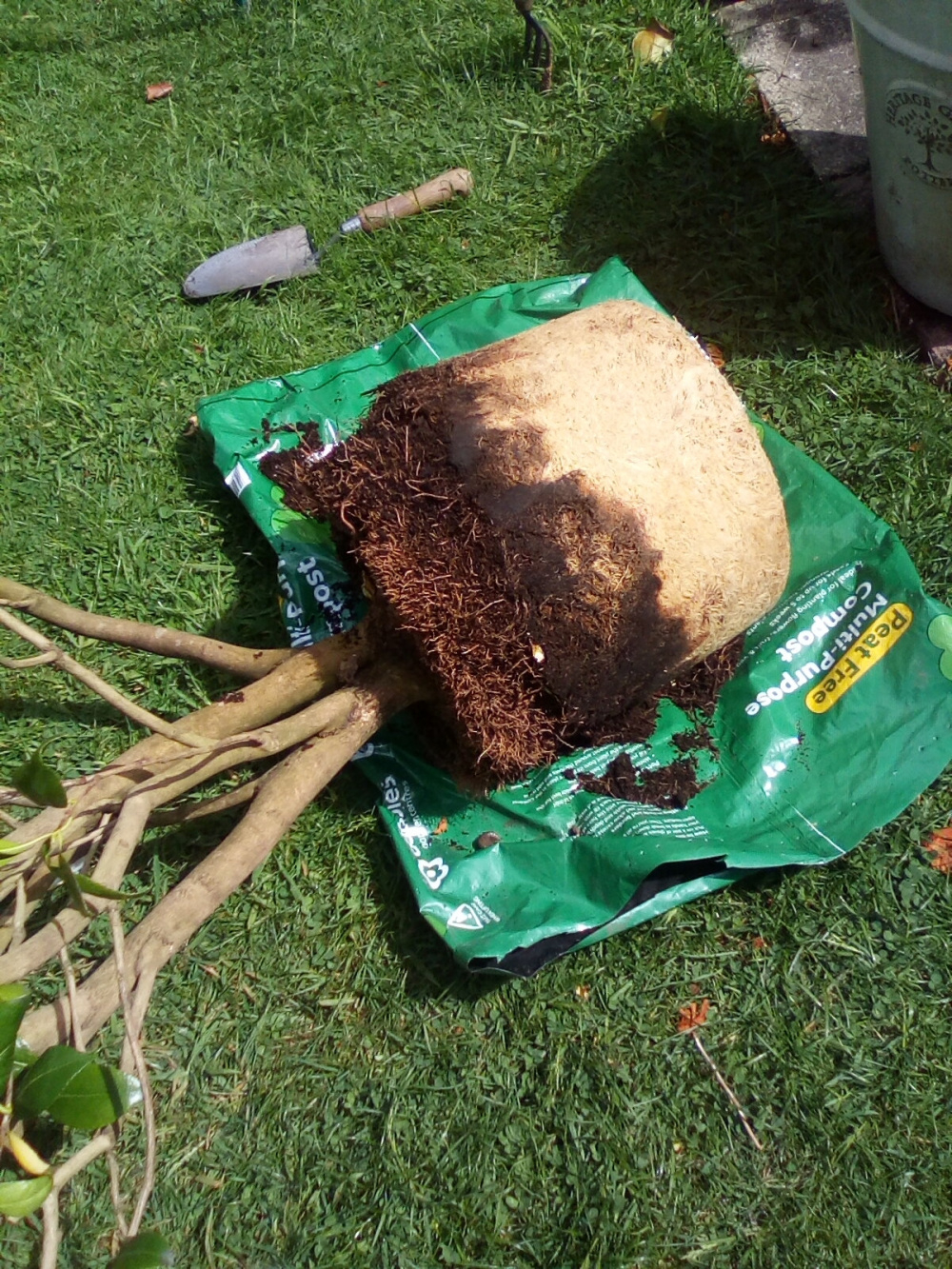 I had one exactly like that, I sawed it down to about 6” teased out the roots, planted it out in the garden and in no time it became a beautiful bush and flowers well.