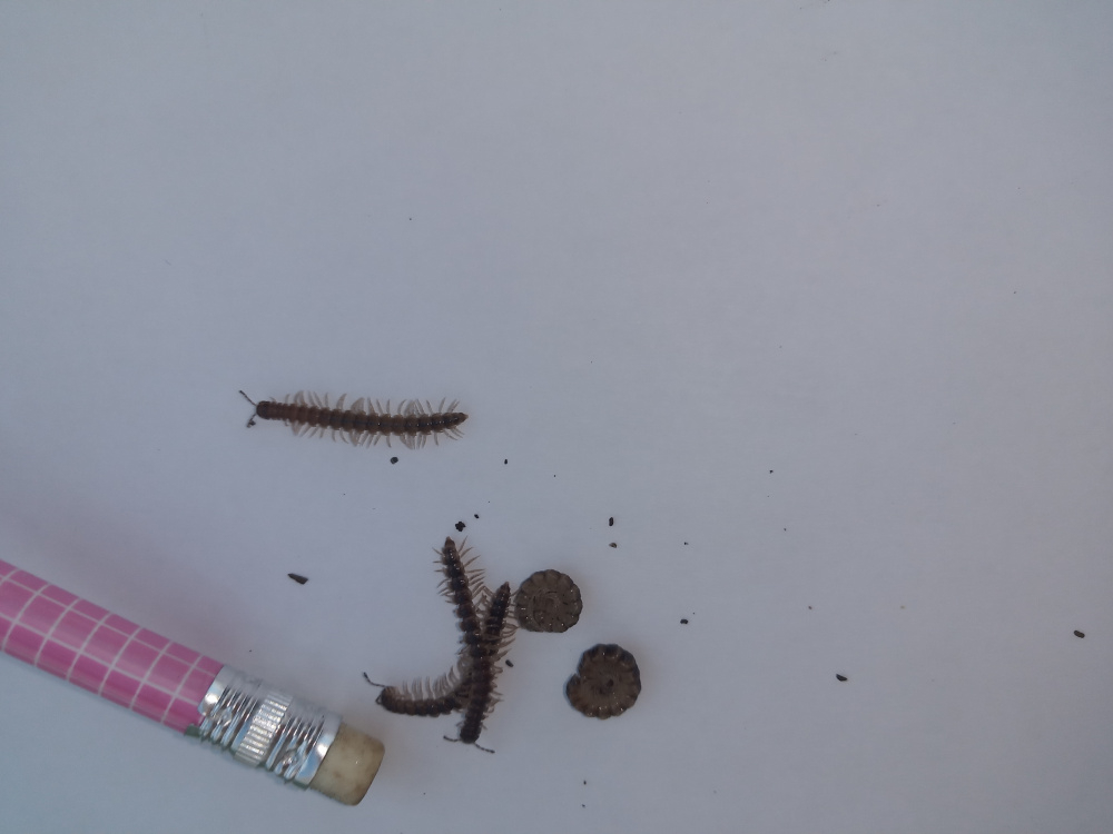 Have taken my orchids outside to water and feed. These critters are in the bottom of the pots of the bamboo orchids....the small variety with tiny scented white flowers in early spring. They are curled up, firstly looking like little snails,then they uncurl and scarper,very fast looking like centipedes.They are mostly black 2/3rds of an inch long. 0