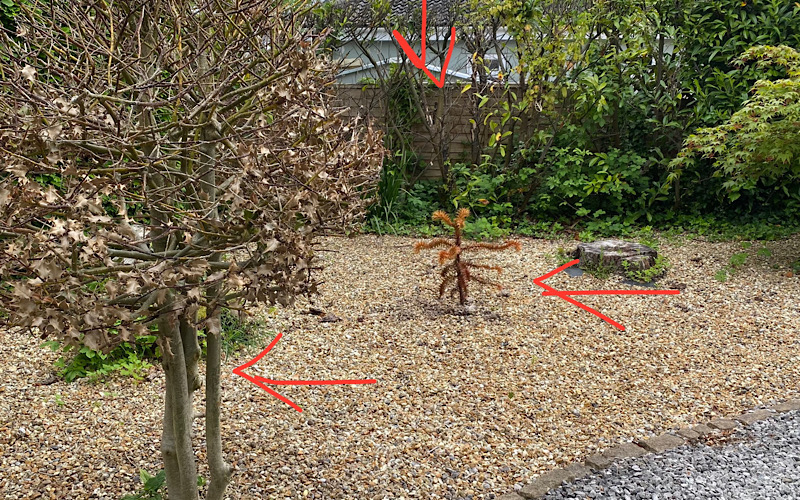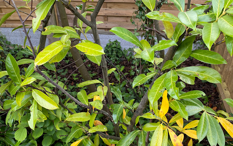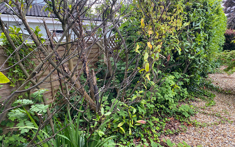 Last year we noticed a section of a long laurel hedge was yellowing and thinning, and a holly was browning nearby. At the time we put it down to a harsh dry spell, but weren’t wholly convinced. Since then a section of 5-10 feet of laurel is barely hanging on for life, there are a few shoots of hope but not many. Either side of this the laurel has thinned and not showing much new growth this season, along a section 30ft or so length. Beyond this the laurel seems healthy and has put on good new growth.