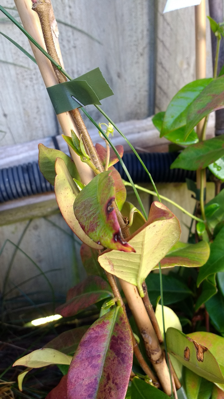 Recently planted star Jasmine is getting holes, brown patches on some leaves, others are turning red to brown. In sunny spot. Any ideas on what's wrong and how to treat?