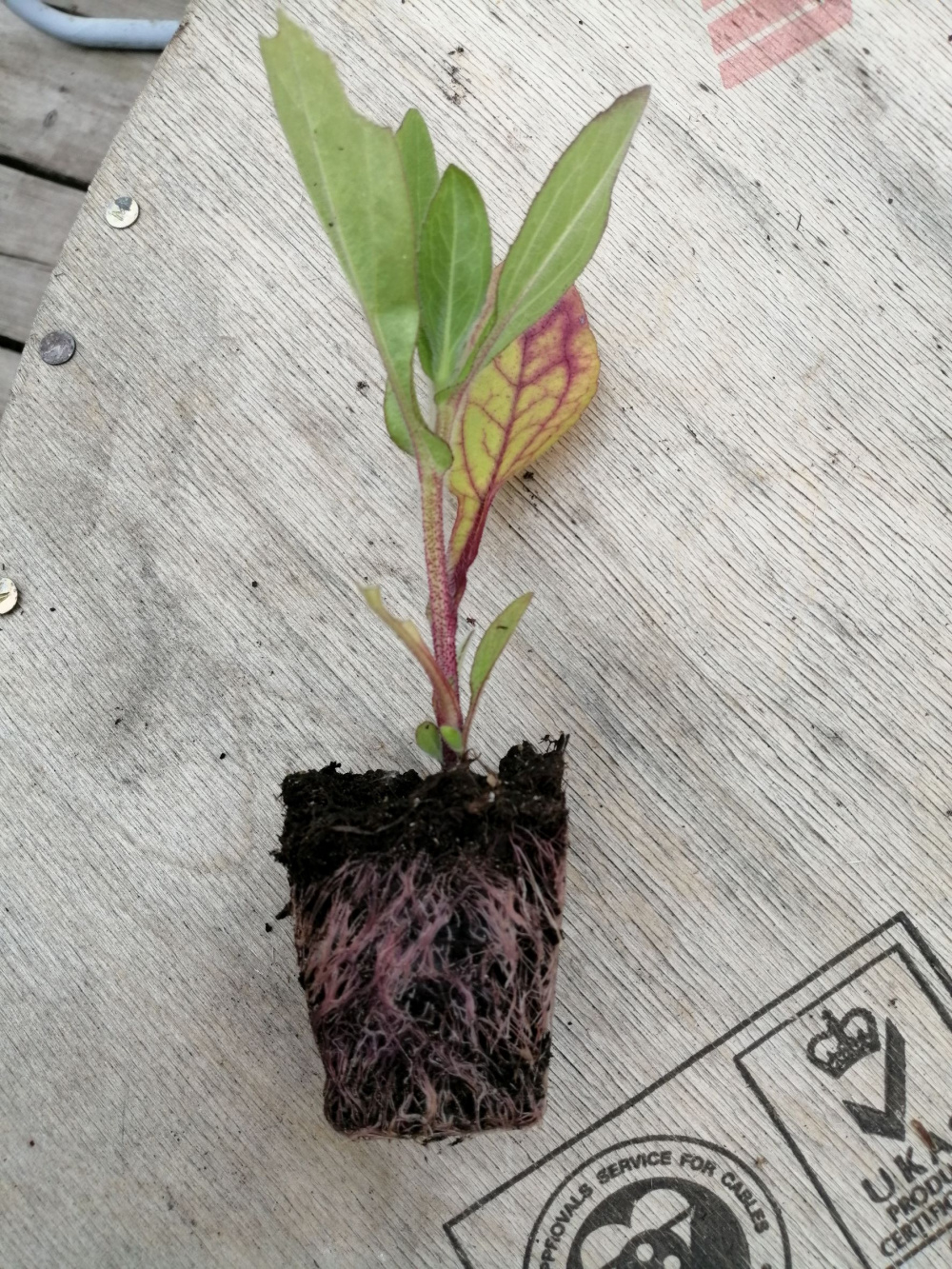 Sods one leaf is purple veined and the others aren't, along with the pink roots.