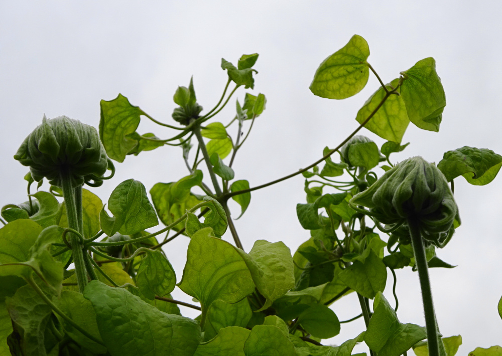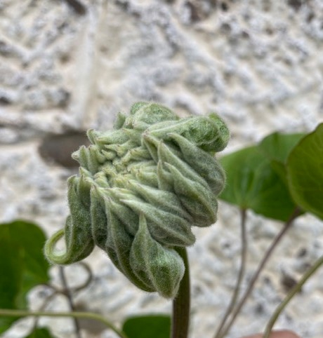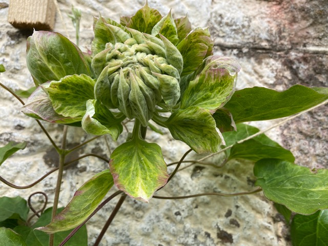 A friend has asked me if I know what the cause of this is on his clematis. I don't so thought I would ask you. It doesn't look like a bud. Doesn't know what variety of clematis it is and hasn't happened before he doesn't think. Any ideas please?