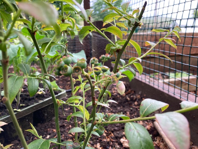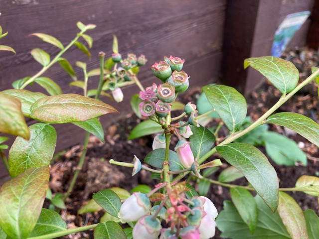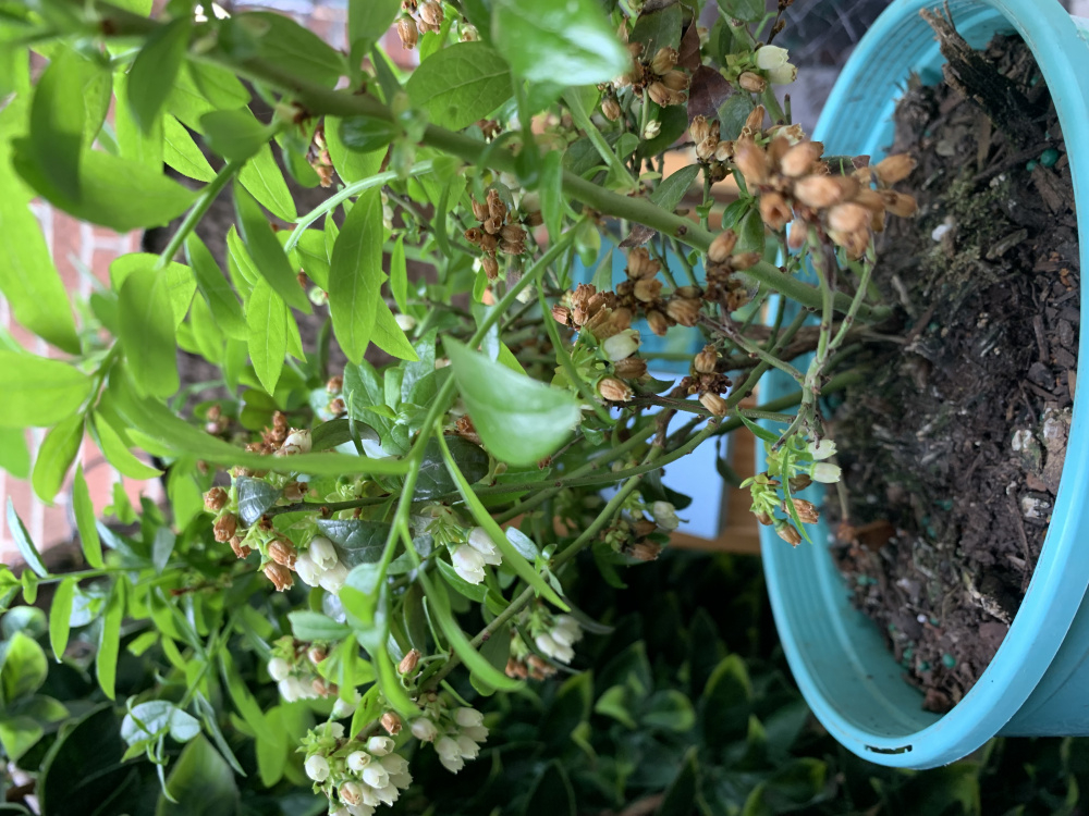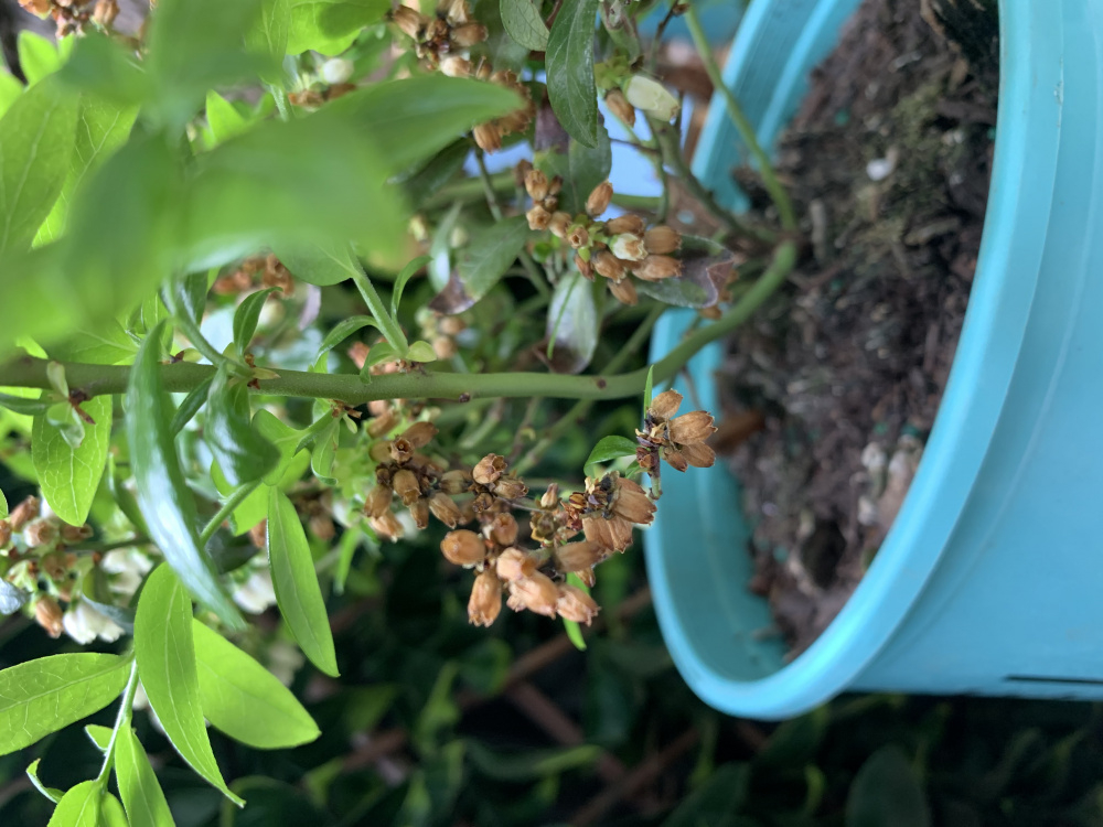 I am trying to grow a potted blueberry variety and up until a week ago they were progressing really well . Lately i have noticed the flowers and green fruits have started to turn brown . There is still new growth and a number of the flowers look okay but there are patches where the flower and fruit have clearly browned and died . Is this normal ?