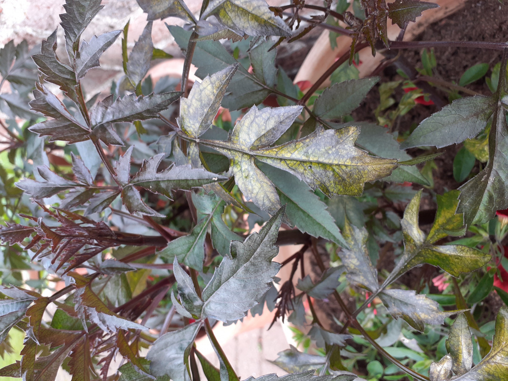 I have 4 dahlia "Bishop of Llandaff" in separate pots. Two of them have this greenish discolouration on a few leaves, and two don't.