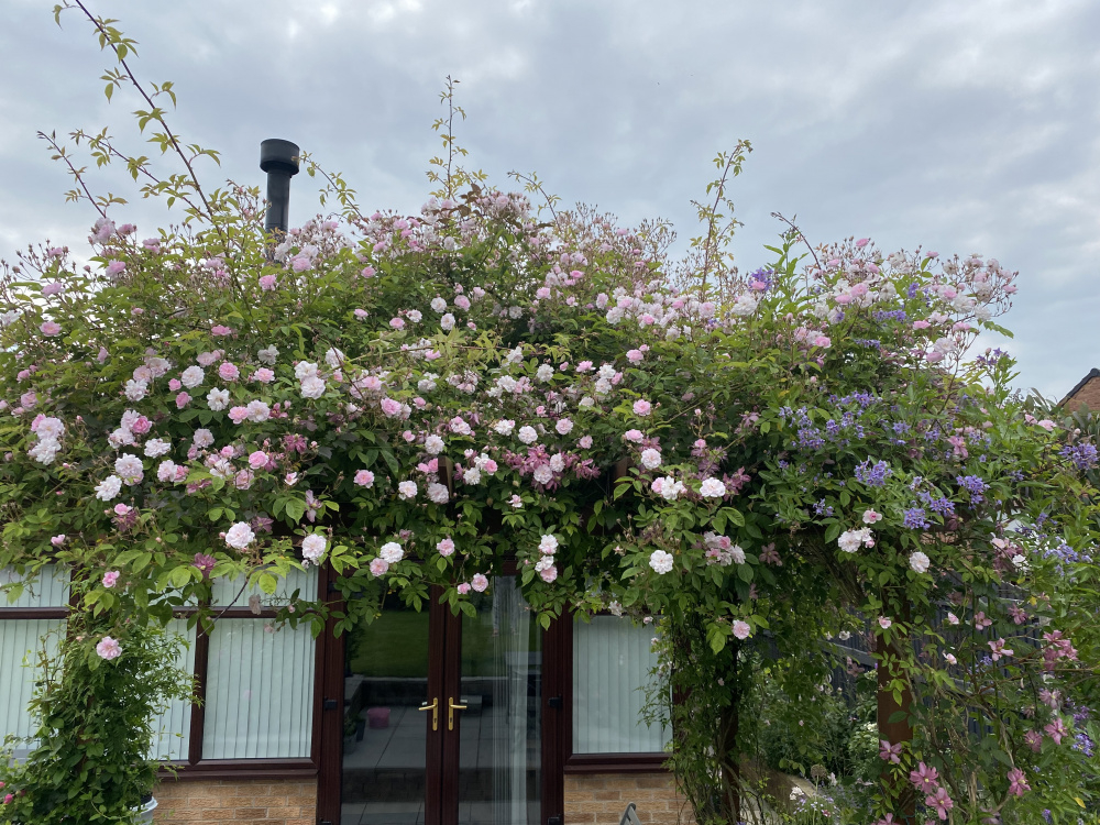 My daughter @WonkyWomble has a Rosa ‘Mermaid’ growing over the shed at the end of her garden in a similar way. It’s also covered with baby ladybirds most years. 😊