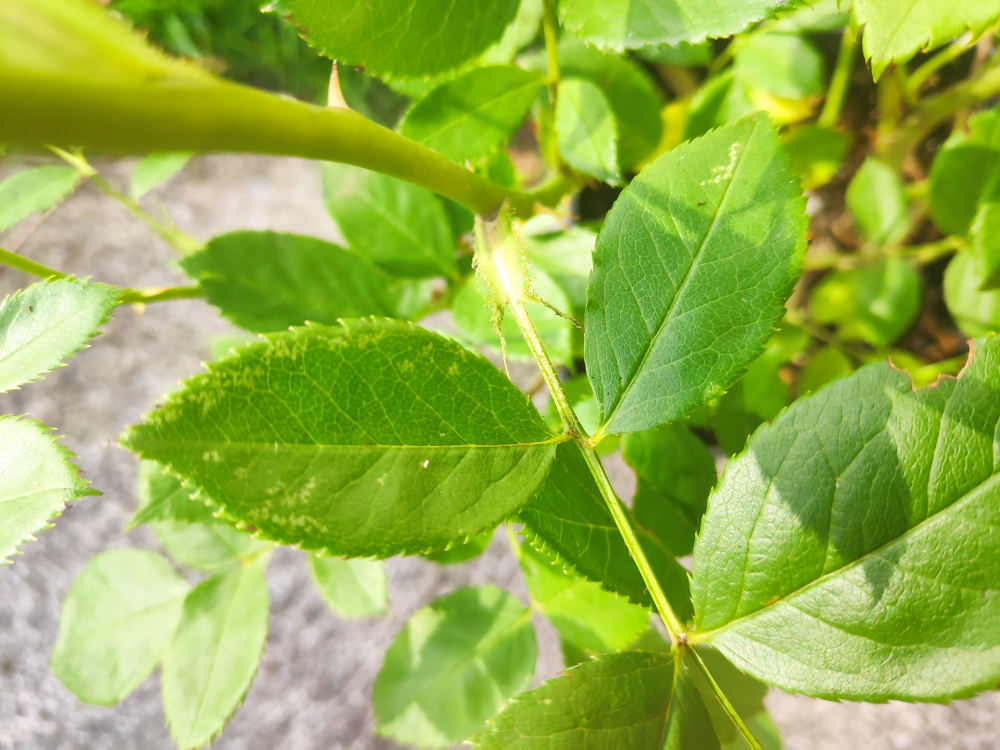 I just bought a new potted rose online (David Austin's Tottering-by-gently) and it arrived yesterday as it was getting dark. This morning I decided to check if there's anything wrong with the plant and found this mottling on a few leaves. I couldn't really find any insects. Some of the smallest leaves are yellowing but that could be due to transport. Help please!