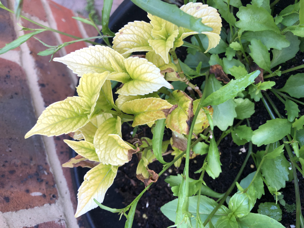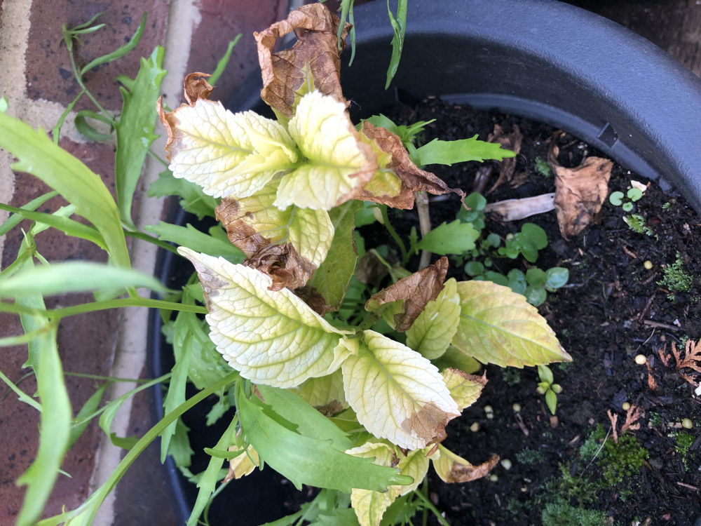 hi. i'm new to hydrangeas. i always liked them so decided to start growing some this year. i got 4 different types and 3 are doing great. but the Glam Rock is very poorly and i really don't know why? it has exactly the same compost mix, was planted same time and its 'pot in pot' with 'Light My Fire'. LMF is already in bloom, but Glam Rock seems to be barely surviving. the leaves have gone pale and look like they're burned at the ends. what is happening to them?i have two of the Glam Rock and both are the same.