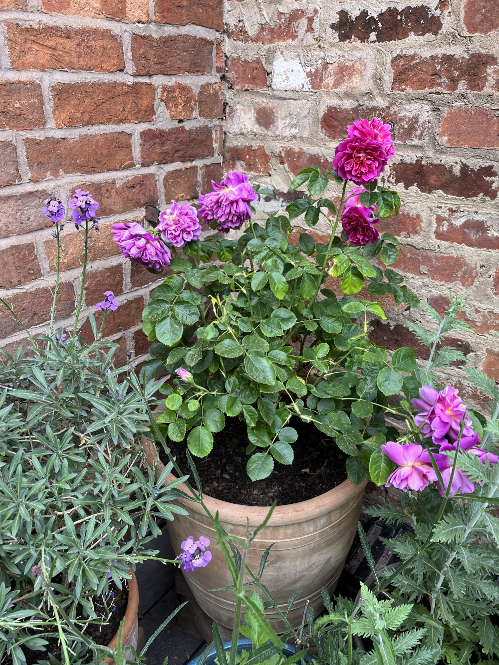 Be generous with your watering, especially in hot weather and more so if that’s an unglazed terracotta pot, from which water evaporates easily.