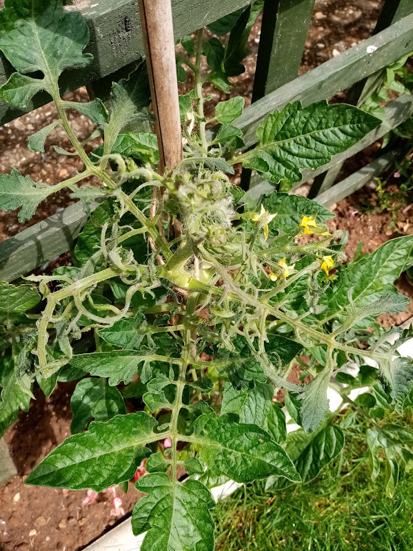 Is there something wrong with my tomato plants? The new growth on the top of the plants seems to be withered. Is that just the normal unfurling of the leaves or a dreaded lurgy? There are flowers forming below this curly growth. I water them morning and evening if it's really hot and feed them once a week. They are planted in a border in full sun against a trellis. I pick out the side shoots regularly.