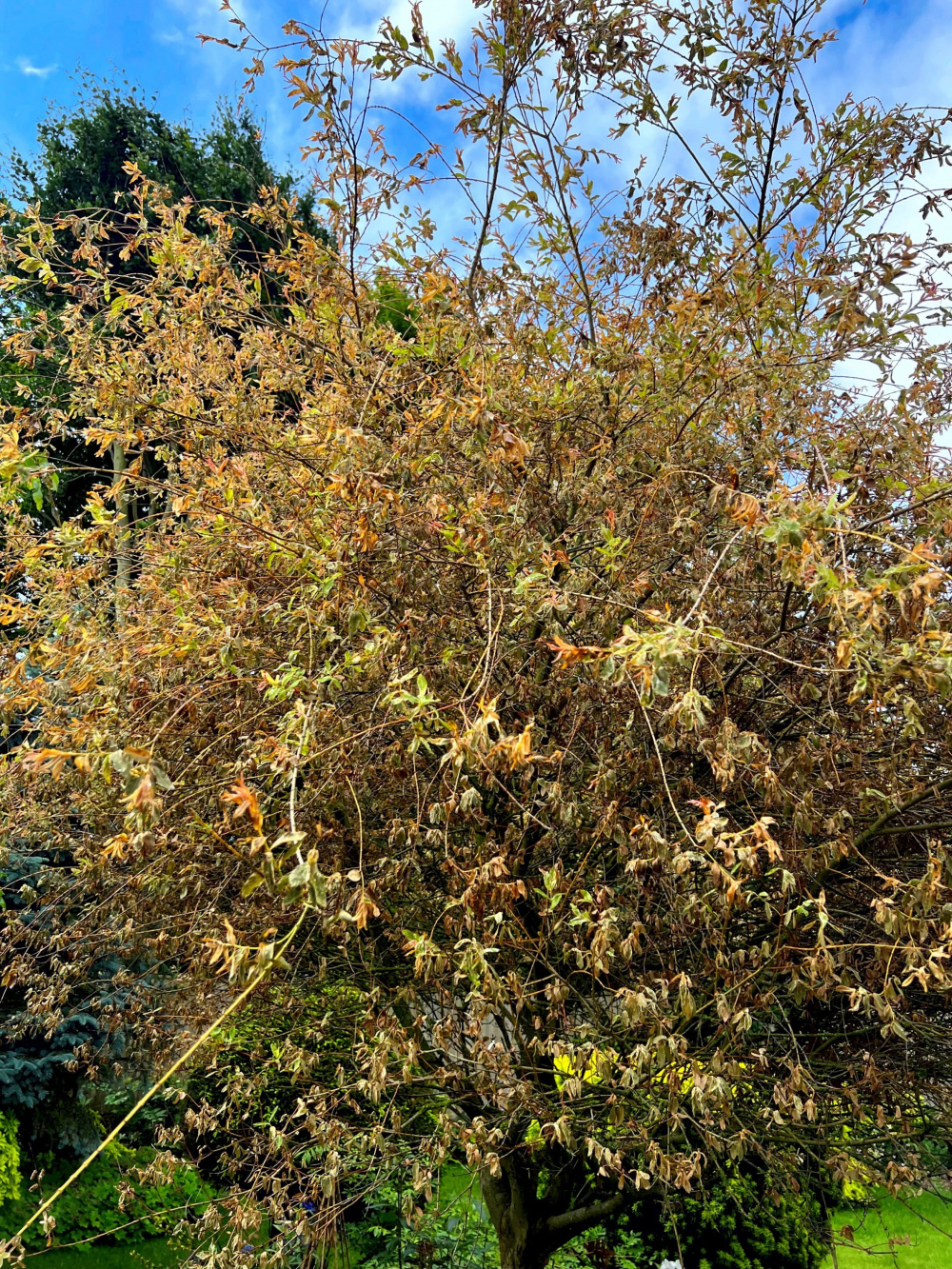 Our mature flamingo Salix has turned brown and I’m wondering what could be wrong with it. It is well over ten years old and has been flourishing the last few years. It’s grafted onto something else. Given it’s maturity and recent rainfall, I don’t think it’s lack of water. There does seem to be something green growing on branches though - I’ll include some pictures. Any suggestions very welcome.I was thinking of pruning and spraying all over with fungicide. Thanks