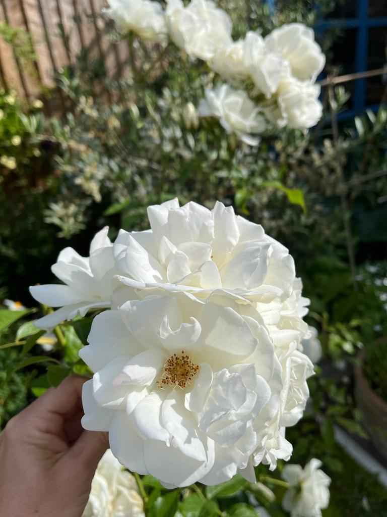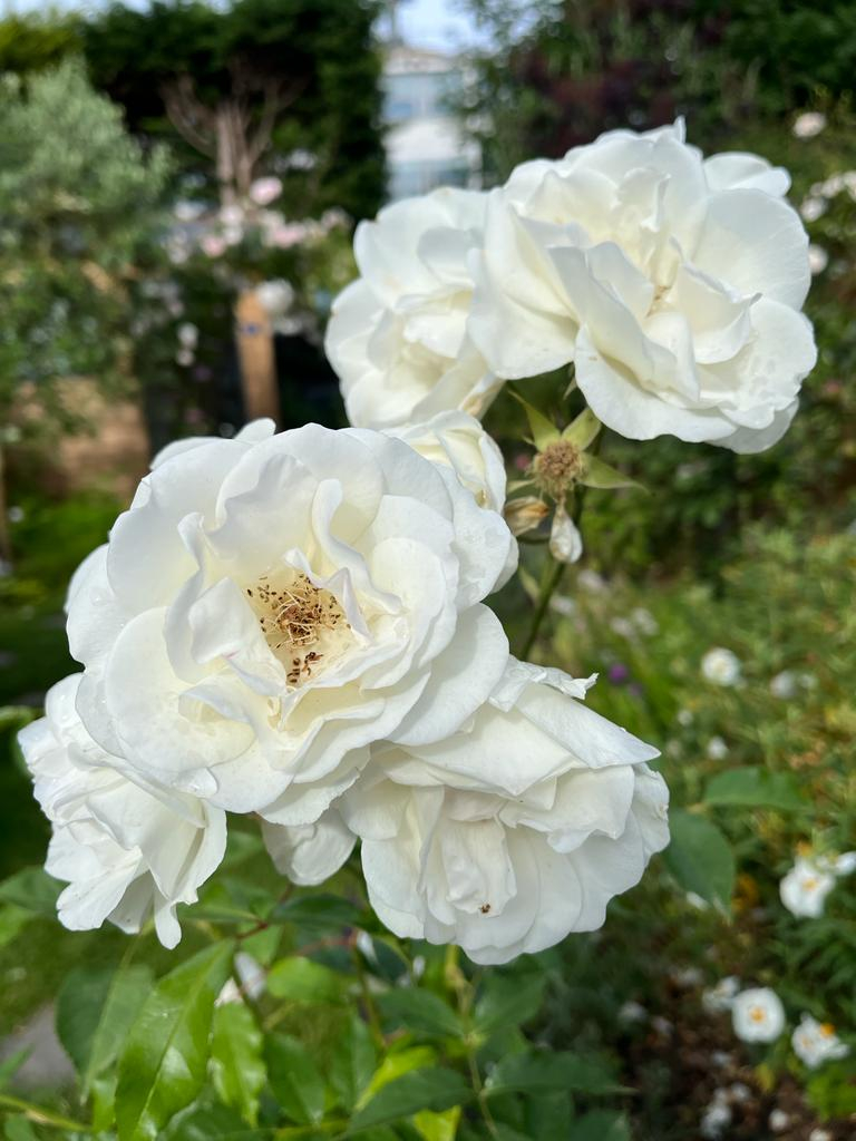 It seems to be a very healthy, vigorous floribunda with pure white blooms and visible anthers that the bees love.