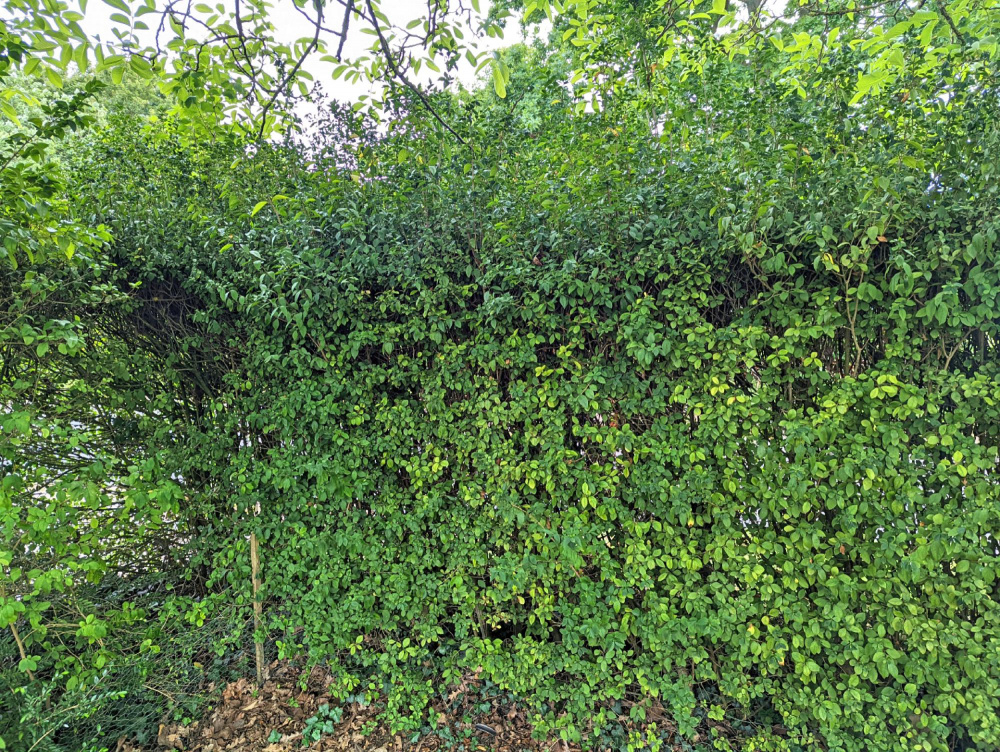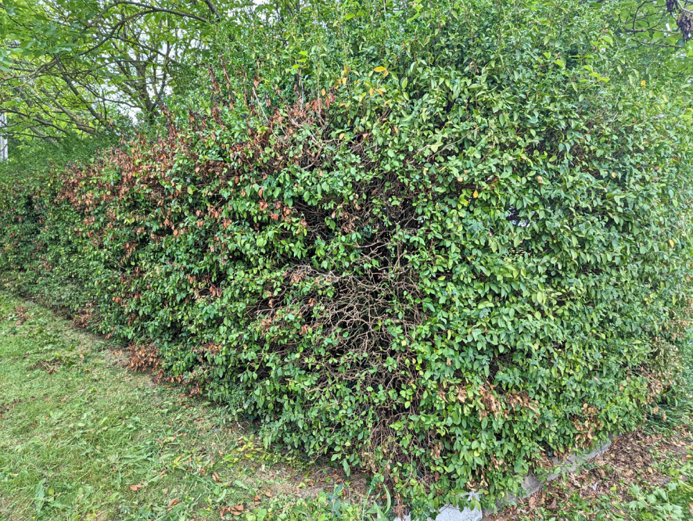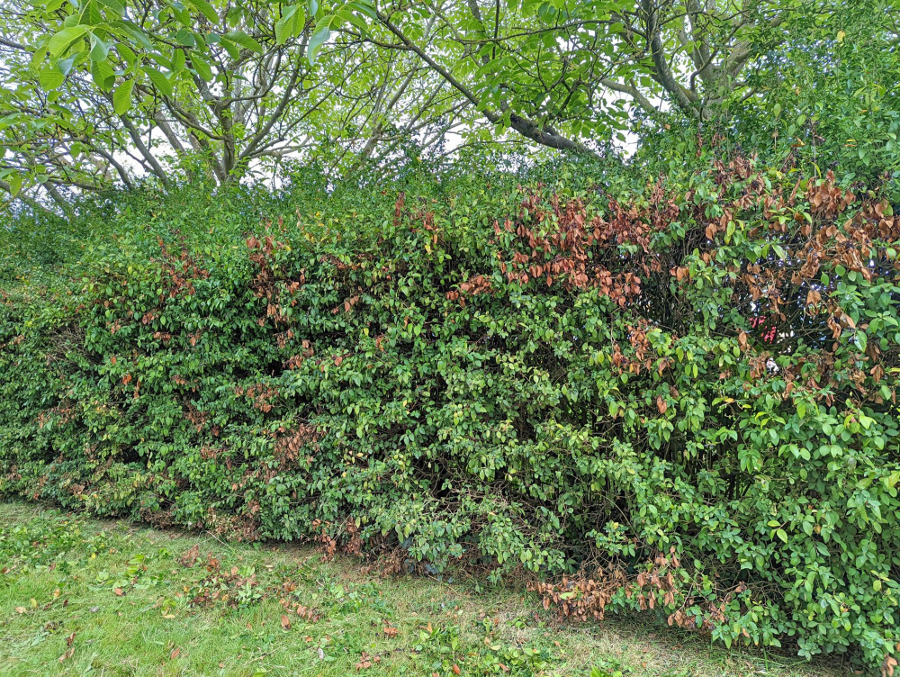 Privet hedge this year started showing some dead branches along the length of the hedge, one side only - with most of each plant looking fine. No individual plant looks heavily affected, so I guess it doesn't look like honey fungus. The other side of the hedge looks fine. It looks single planted, so the plants seen on the back are the same as on the front.