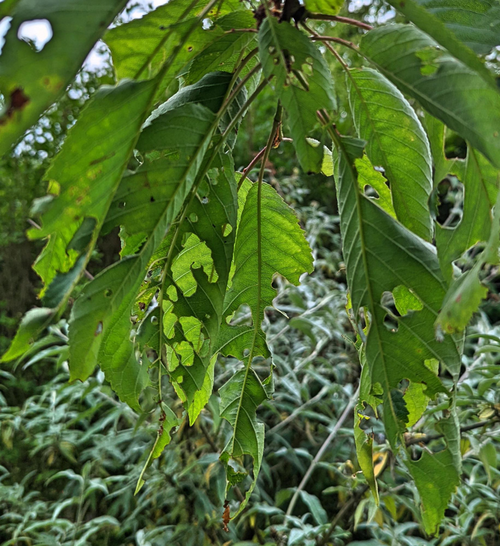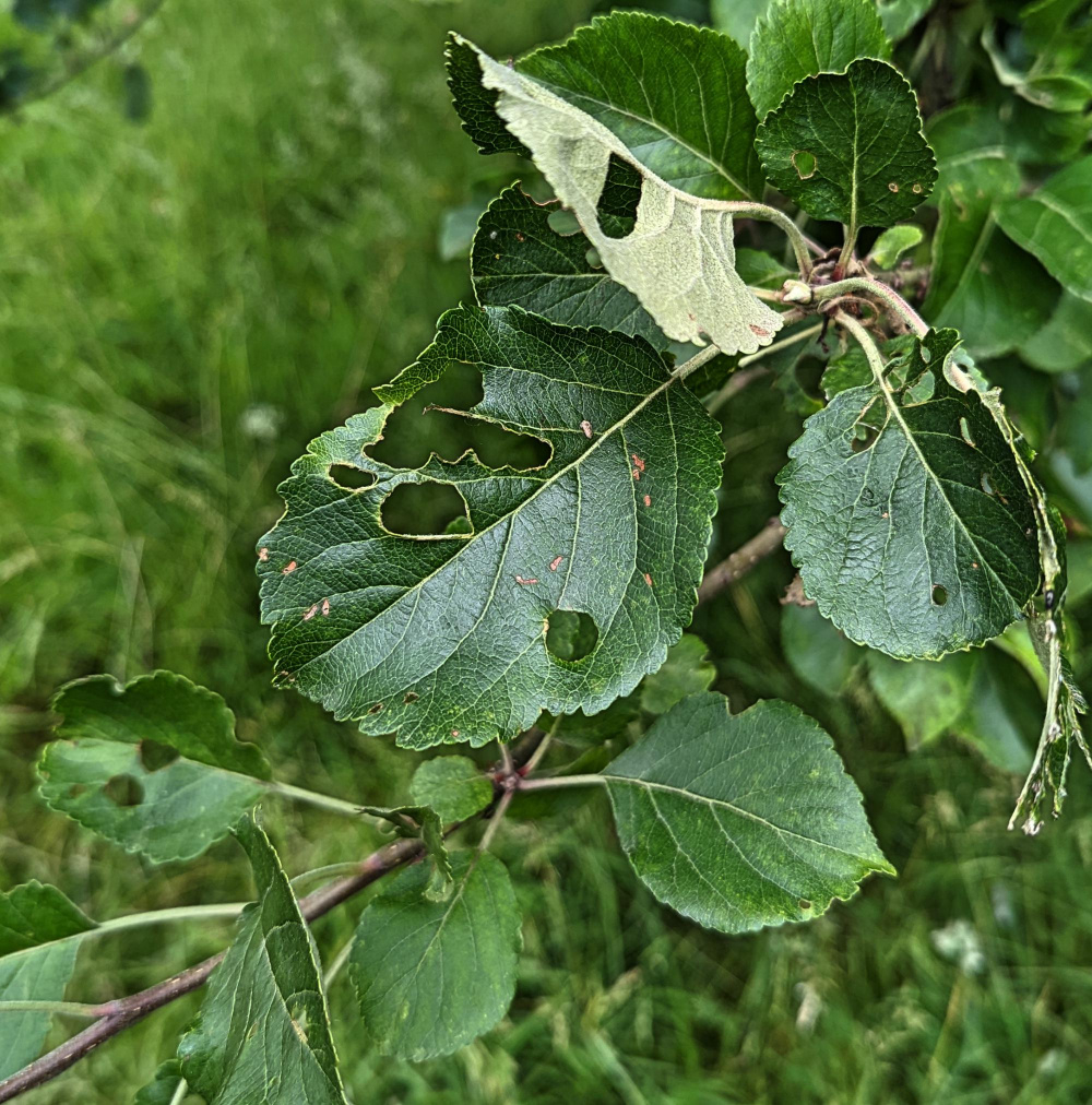 Many leaves on a cherry tree show damage, and now similar (maybe not identical) damage is on adjacent apple tree.