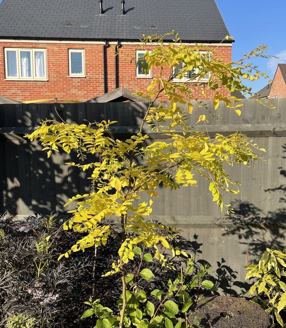 This year, my robinia friscia (planted as a whip 3 years ago) isn’t looking too well. Branches are dropping, leaves are discoloured and wilted, some just drop off when touched. 🙁