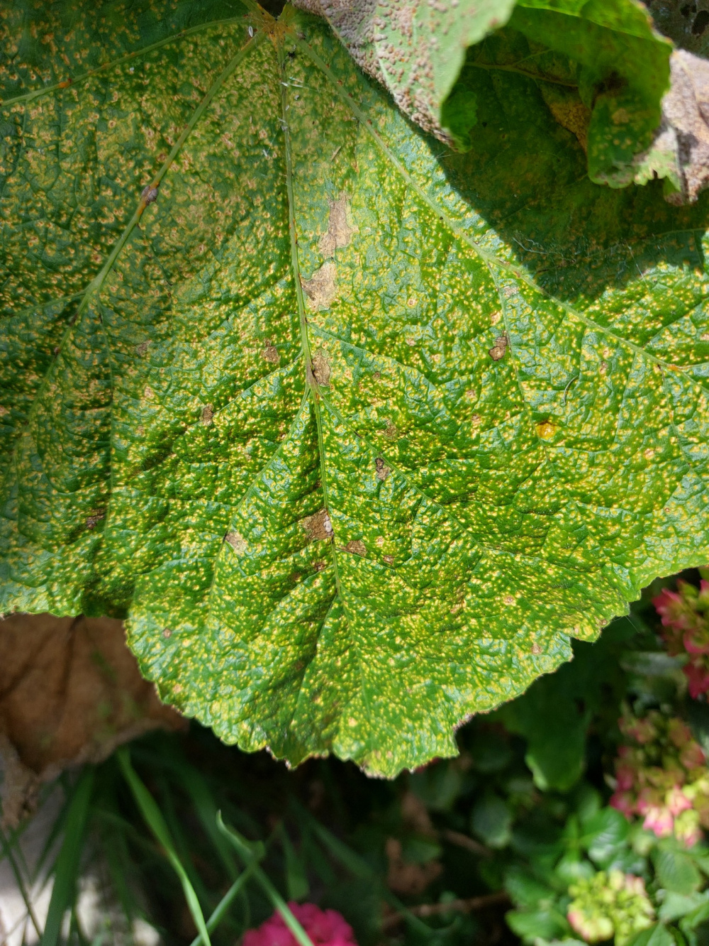 It’s Hollyhock rust … it seems almost unavoidable if you grow hollyhocks. I find they can carry on for several years just coping with it, and then that area of the garden will need a rest from them for a few years while you grow them next year.