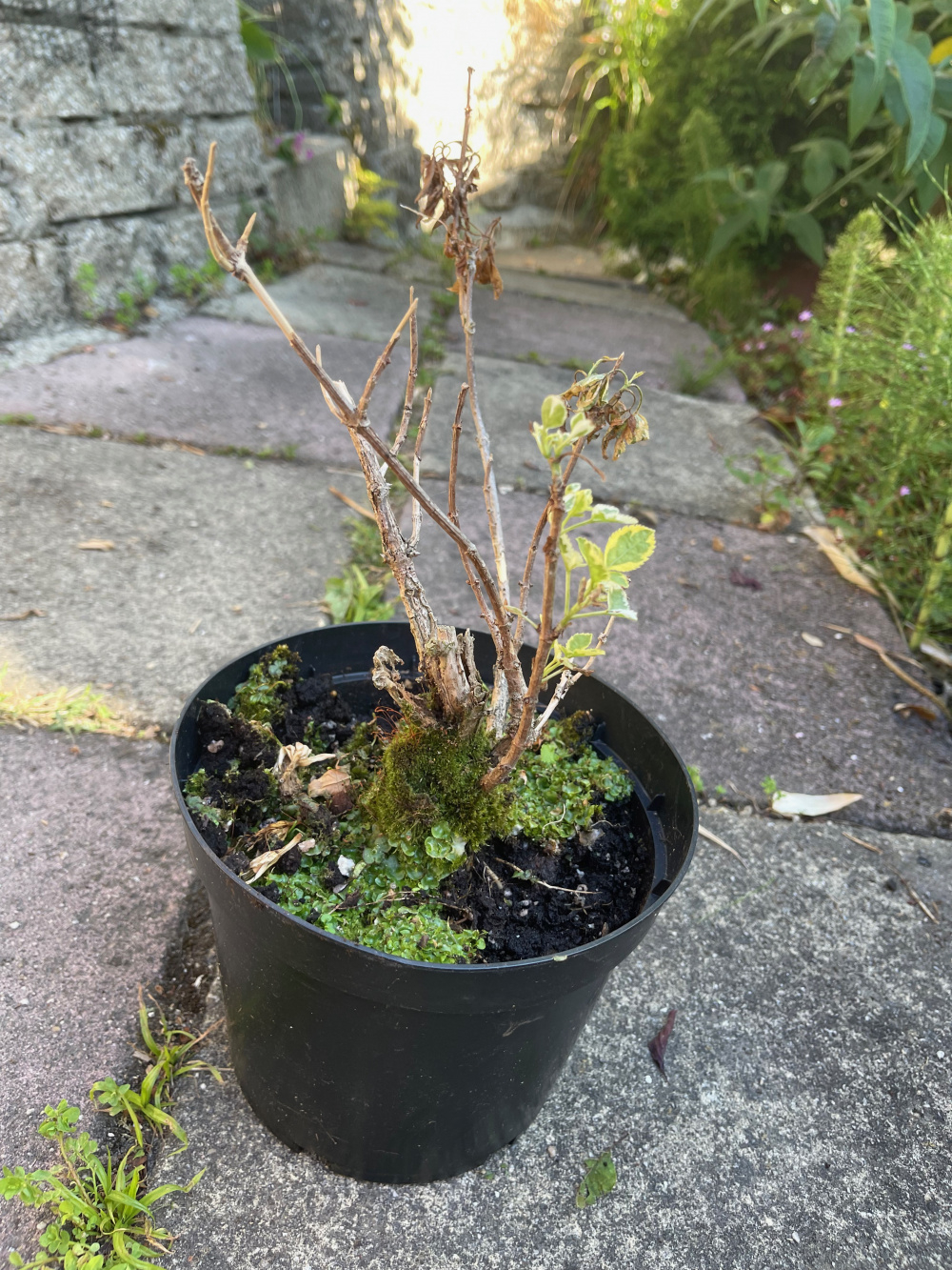 As said above - get all that green moss and liverwort off the top - that will be rotting the old stems.