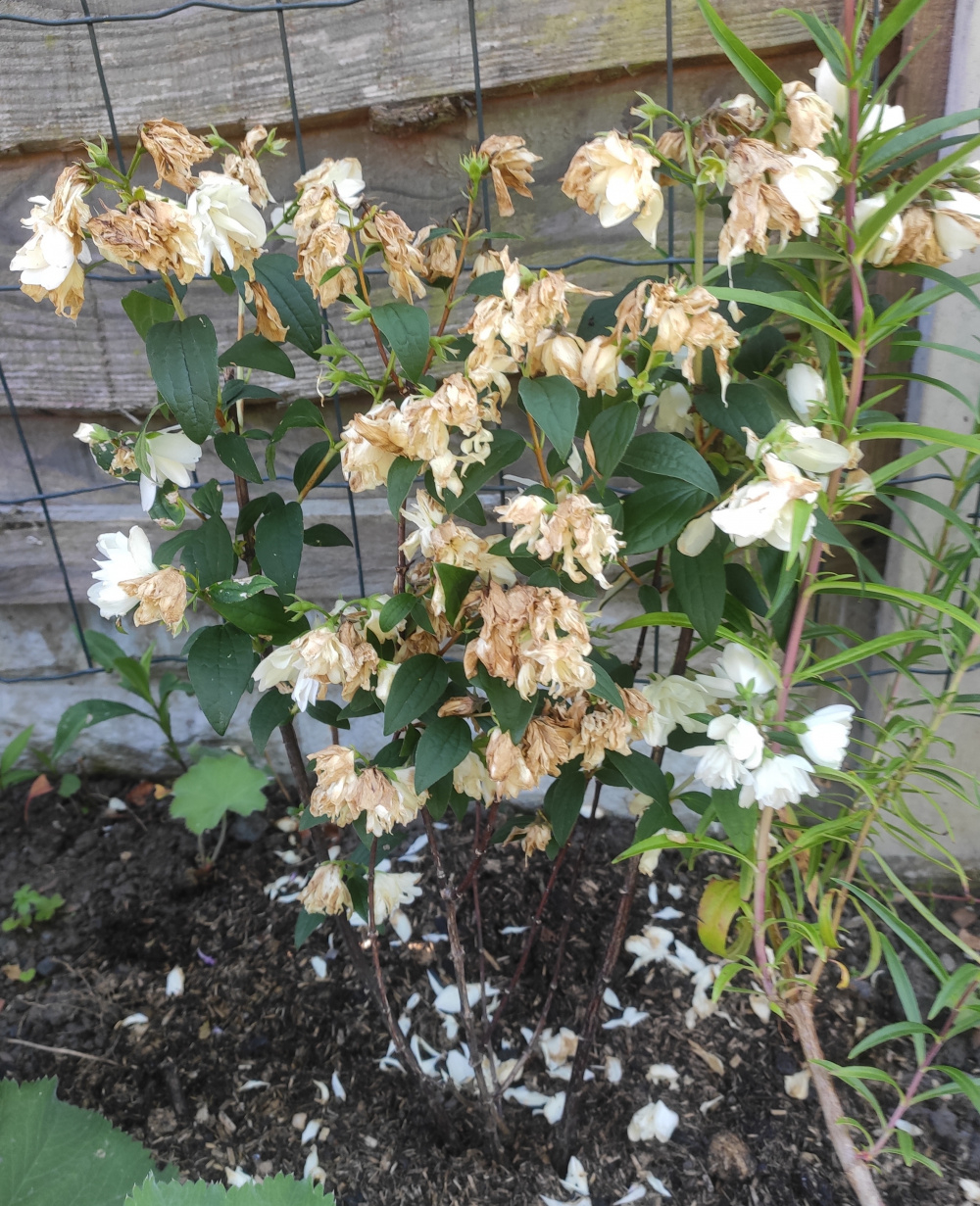 After some heavy rain, my Philadelphus is looking a bit sad. I've only had it a couple of months. Would deadheading it make it flower more, or should I go ahead a prune it back now? Or just leave it and prune in July/Aug? Many thanks