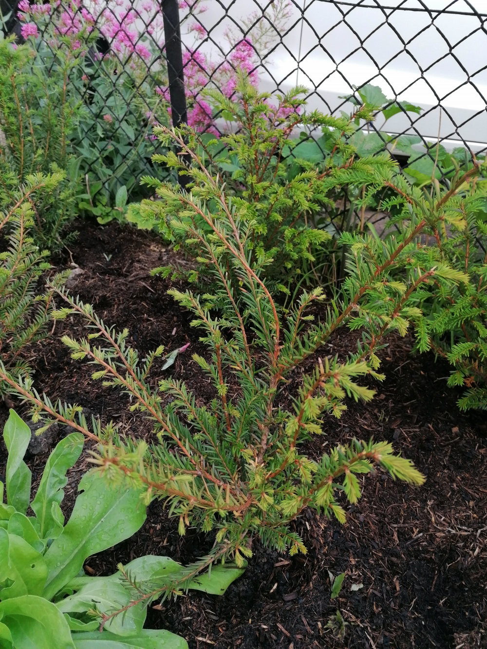 This one yew however seems to just have branches going out to the side but has no main leader and I'm worried that all the others will grow tall around it and this one will just get lost amongst it all and have it's light blocked out.