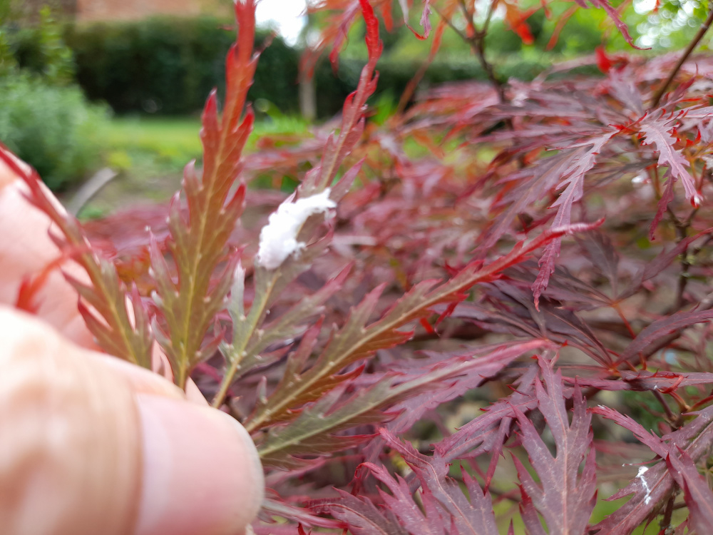 Hi everybody, today my husband noticed that my beloved red Acer has developed white residue blobs on and under the leaves, mostly on the top branches of the tree. The consistency of the blobs is like a sticky gooey toothpaste.