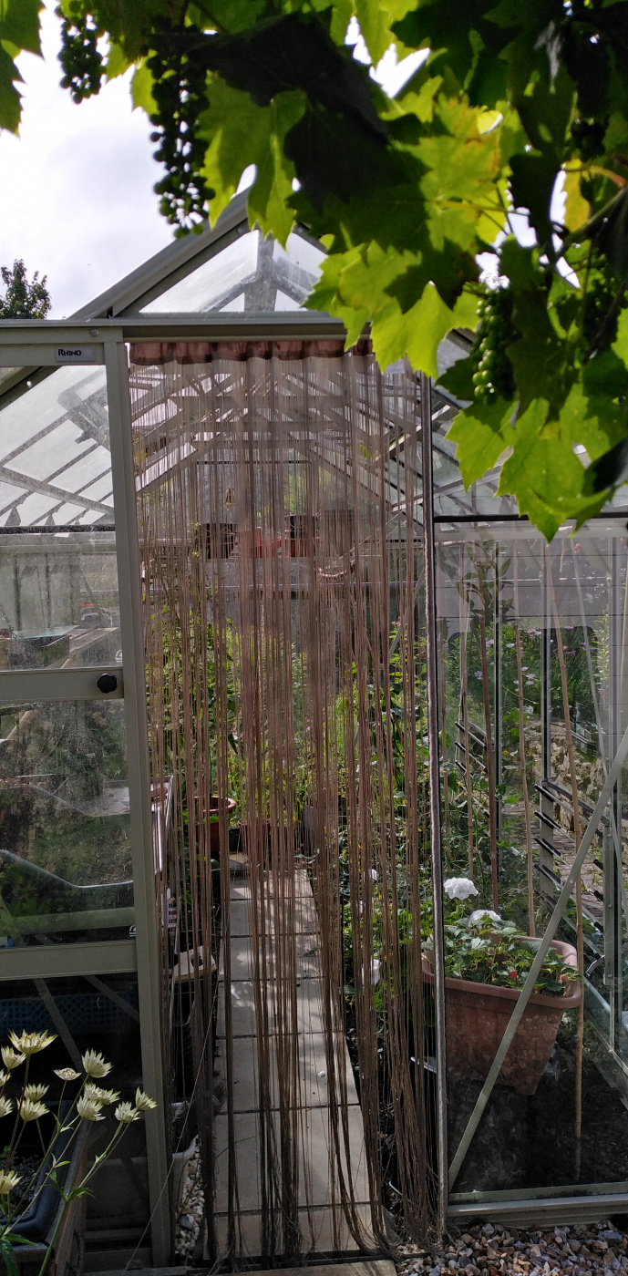 I've got a string curtain across the door of the greenhouse as the birds were getting in there quite frequently. It moves constantly with even the smallest air movement but the insects still manage to get in. I was looking for one of those gaudy plastic things but found this at a car boot sale.