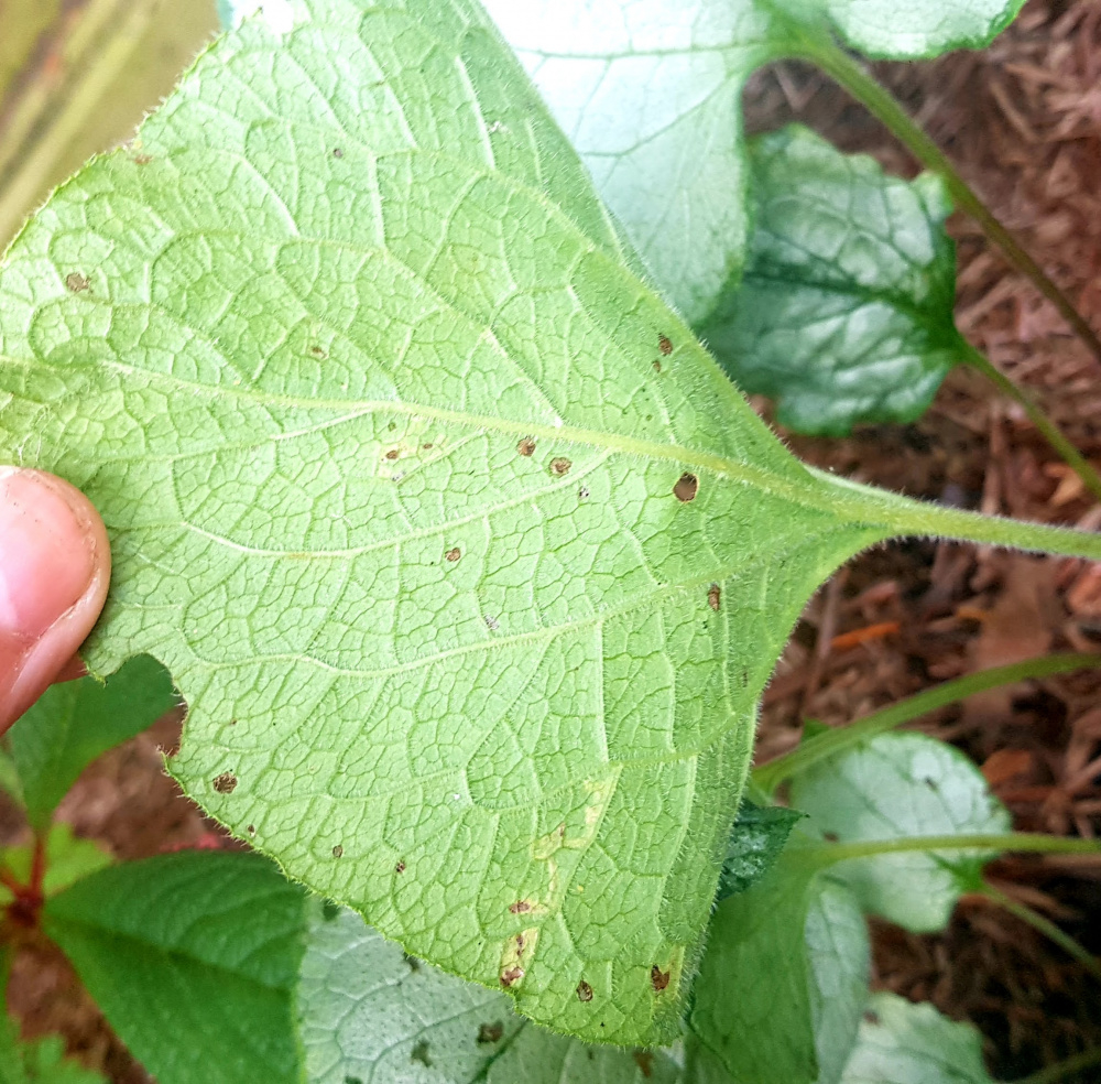 I might have watered too much lately and occasionally over the leaves too. Two plants started having these little grey holes on the leaves and on one of them, the holes looks not through but a greyish patch almost transparent.