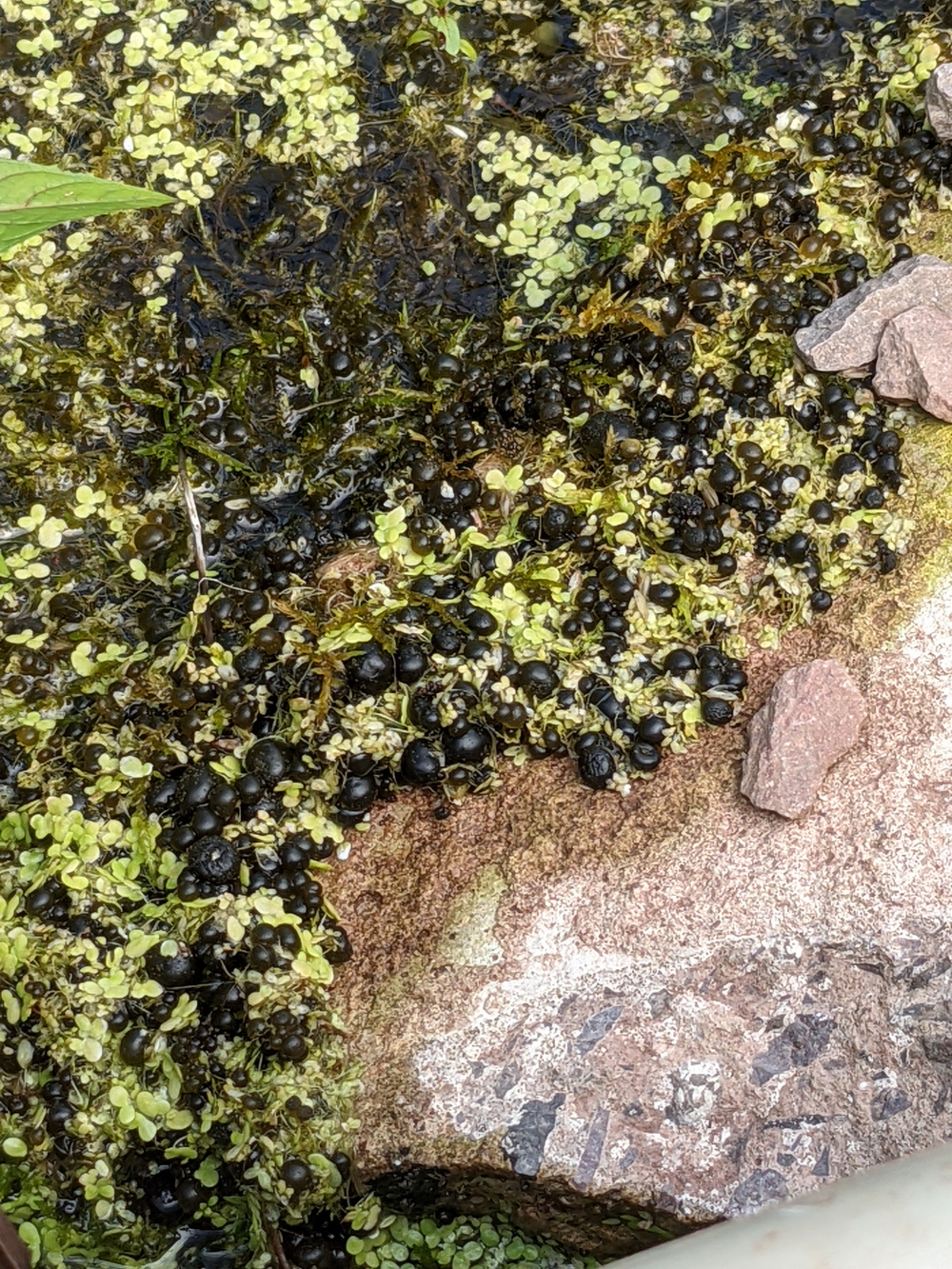 Just wondering if anybody has any idea what these black sort of balls or berry looking things that have appeared in one corner of the pond in amongst the duckweed might be?