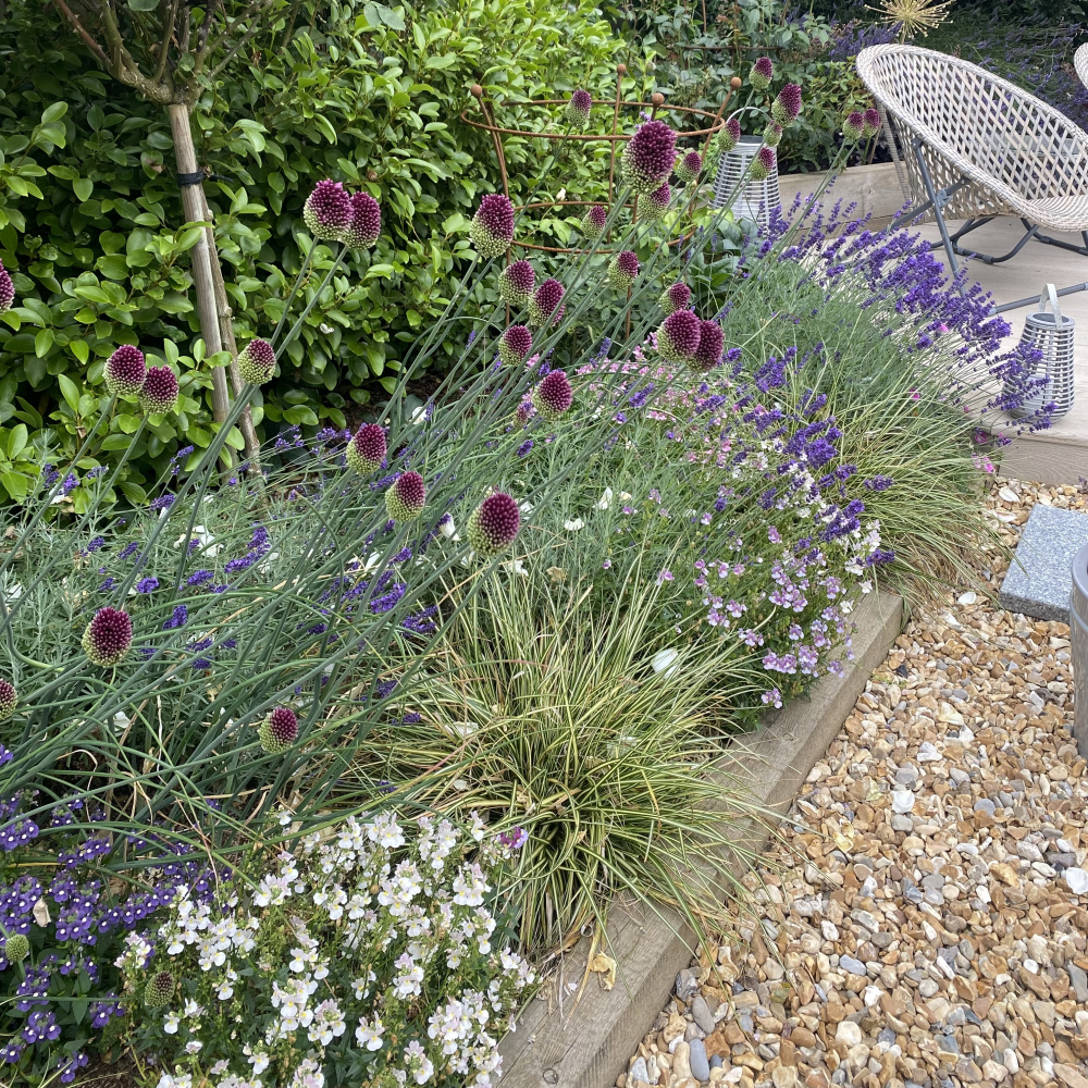 The Whites are ‘Wisley Vanilla’ and there’s a ‘Pink Mixed’. I can’t remember the purple at the back’s name but it’s new to the bed this year.