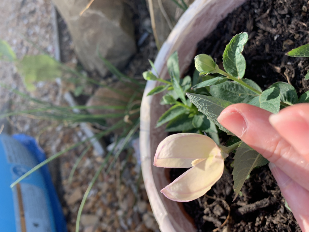I'm pretty certain it is a variety of platycodon (Balloon Flower). They die back in the winter and pop up again in late spring from the underground root. I started off with a blue one and now I have pink and white too as they self seed quite happily. The only thing I don't like about them is when the flower is finished it stays put and looks tatty, so needs to be cut off. The white sap can be a skin irritant.