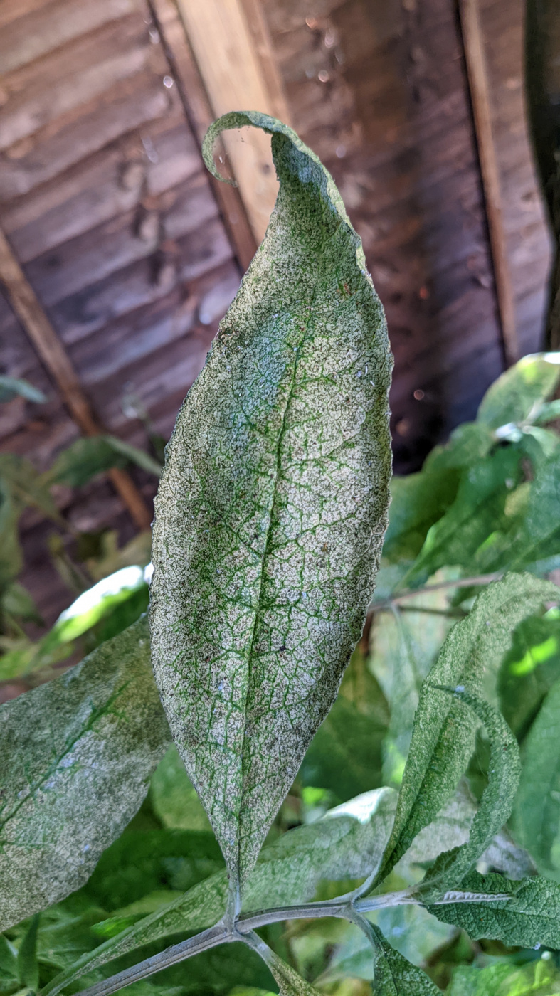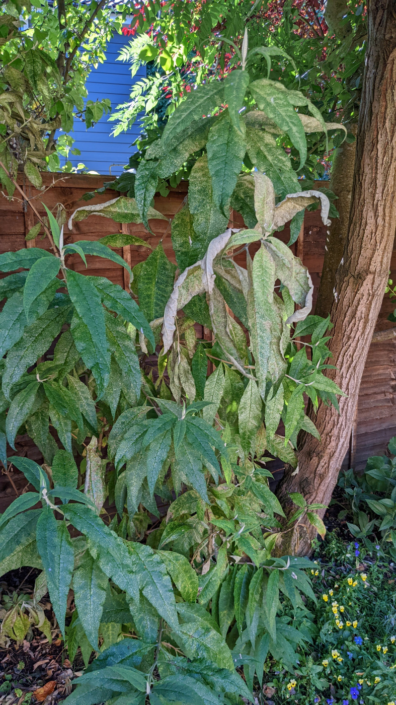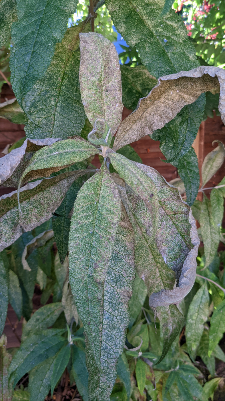 Hi all, our buddleja globosa appears to be struggling again this summer. The plant has been in the ground for 2 years now and a similar thing happened the same time last year. The plant goes from vigorous, healthy growth to the leaves turning a patchy yellow/white colour, eventually drying and curling up before falling off. The plant itself is mostly in the shade until early evening, we water it when the soil is dry ensuring only to water the base. Is anyone able to shed some light on the issue, and how to resolve it? Many thanks in advance