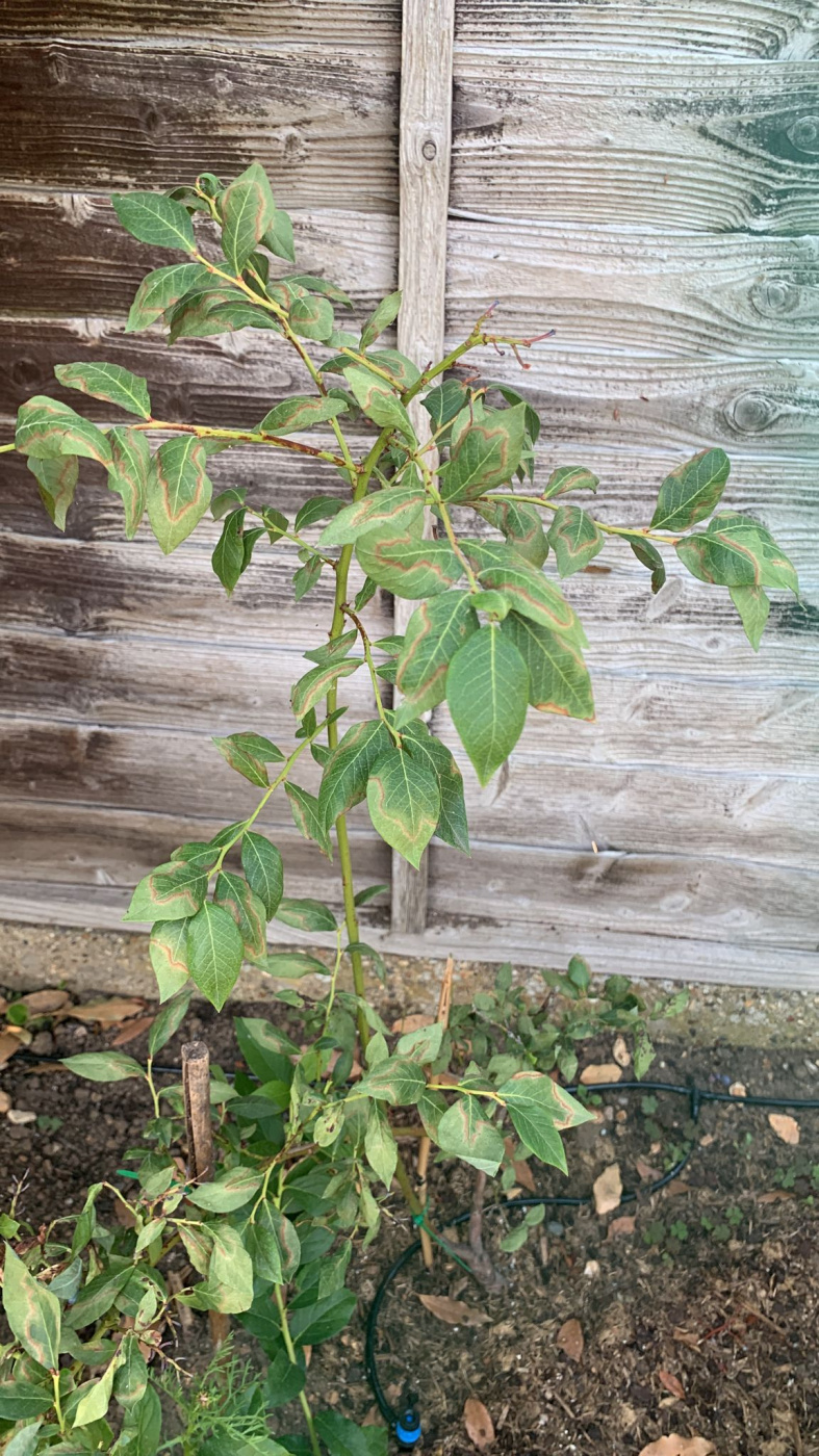 Hi, just noticed my blueberry plant has a funny pattern on the leaves not sure if it is scorch or just too dry! Have been giving plenty of water recently while it’s been hot. Please help!