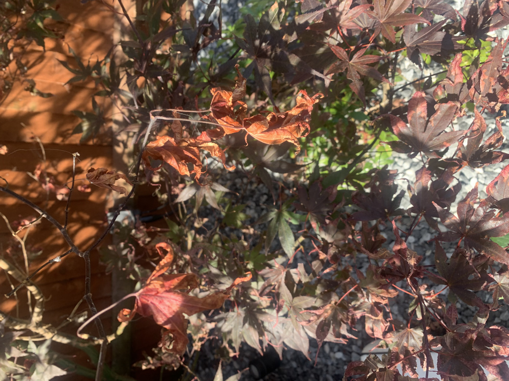 It looks as if it's very close to the fence, which will always be a drier site. It also looks as if it has some scale insect on the branches. Many people have been querying that on their Acers this year too. That can happen on shrubs which are stressed too .