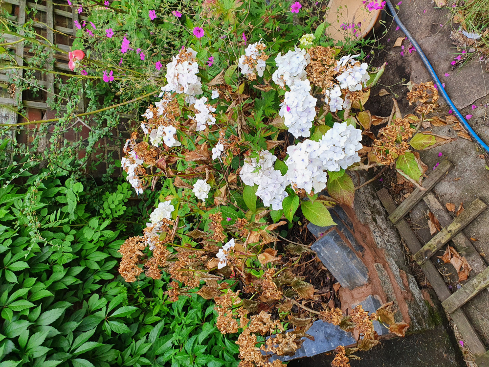 During the recent heatwave my plants have suffered as per the attached photos. My hydrangea, japanese anemone, clematis, roses, lavender, potato plants