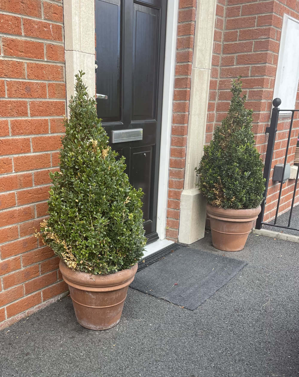 Buxus are hungry, thirsty plants and those pots are verging on the too-small side.