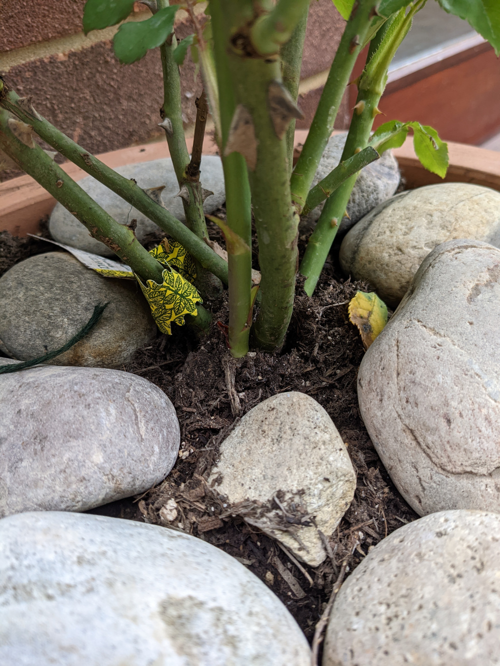 BTW the pebbles are there to deter our aggressive squirrels from digging to bury nuts, all my pots have them, they also do seem to help retain water/moisture in the sun