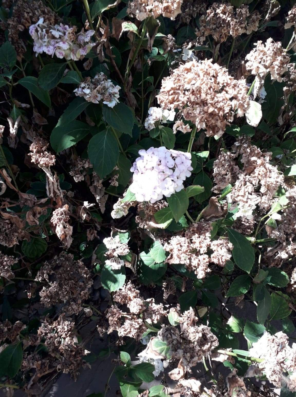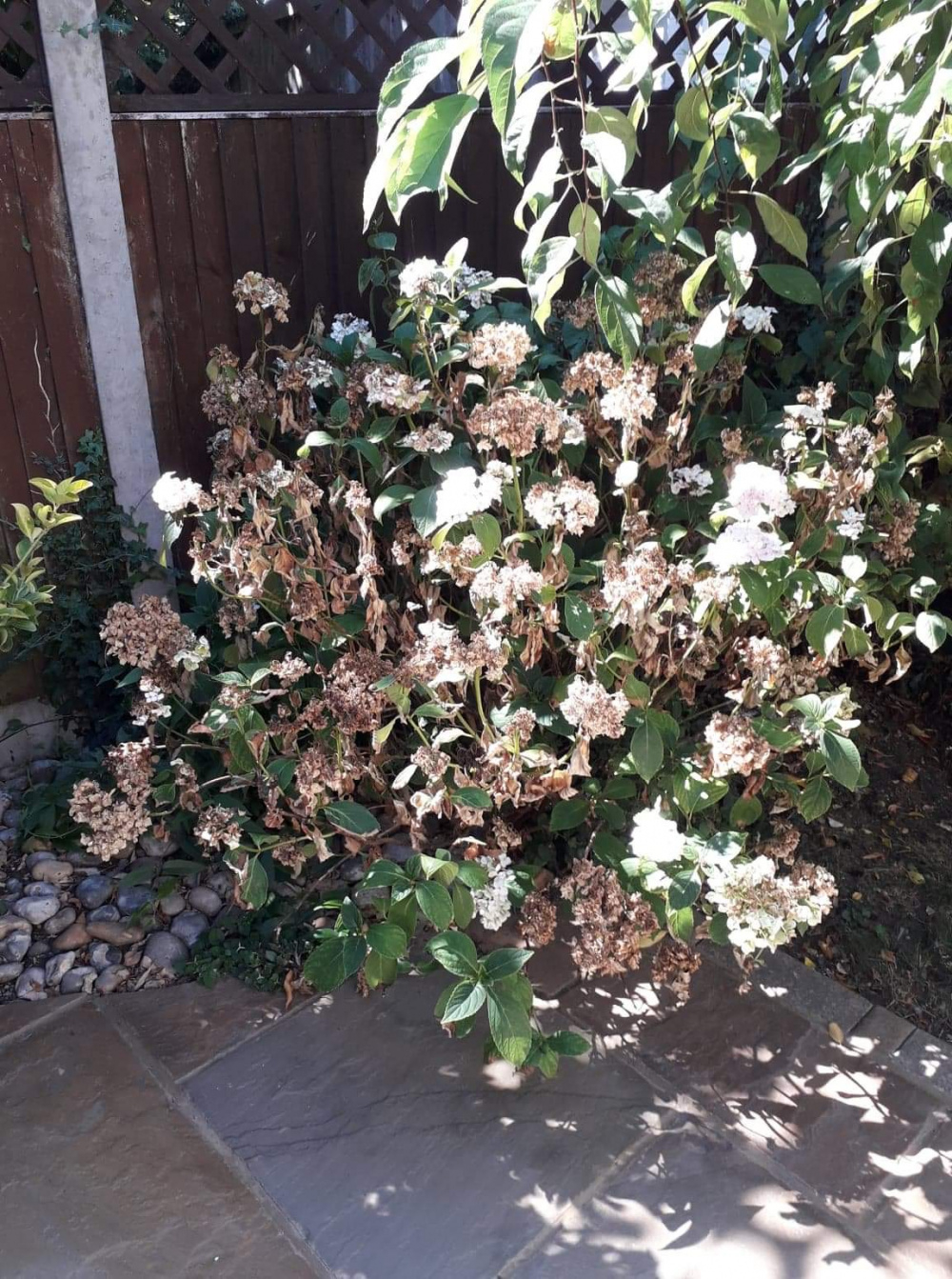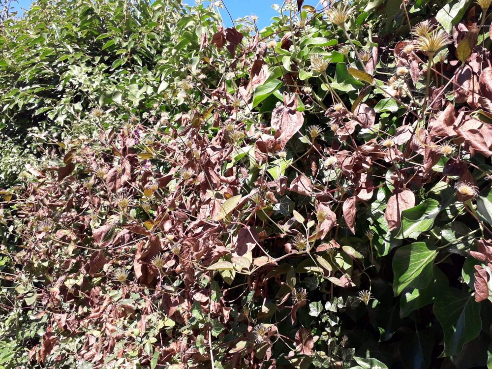 Could anyone give me some advice? My clematis has been completely fried by the heatwave and is now crispy and brown, do I leave it (it looks really awful) or cut it back? And my hydrangea has some parts flowering, but other parts look dead. Can I cut the dead flowers back, to make it look nicer, or should I leave them in place to protect against frosts? 😱