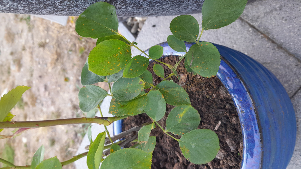 Hi, I was given a rose bush last week in memory of my dad who died on this day last year. I put some dried rose feed in the pot when I planted it I've been away for the week and the neighbours have been watering it (not sure how often but it isn't dry). I've come home today and it has these spots on the leaves, should I be worried? Could I have over fed it when I planted it?