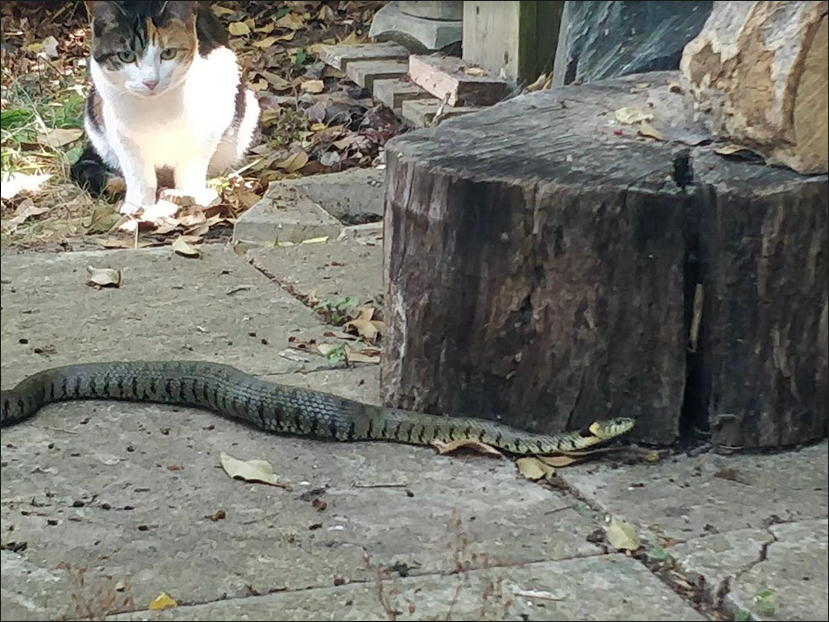 This snake had just visited our pond. Might some innocent frogs just have landed up inside, or could it be a pregnancy? Grass snakes lay eggs in June or July, so the former seems more likely. Our cat is not very bright (established on other occasions), and got at various stages quite close. I thought cats were supposed to be more afraid of snakes!
