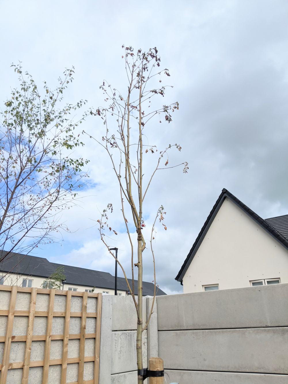 Our newly planted Rowan tree seems to be dying, it has a mixture of mostly brown leaves and some green but the number of brown seem to be growing. I've also noticed the bark on two of the branches has split. The tree was planted about 8 weeks ago before we moved into our new house, it was probably neglected and not watered during the recent hot weather, we got keys last week and have been watering it every day. Can we rescue it? Any advice will be greatly welcomed!