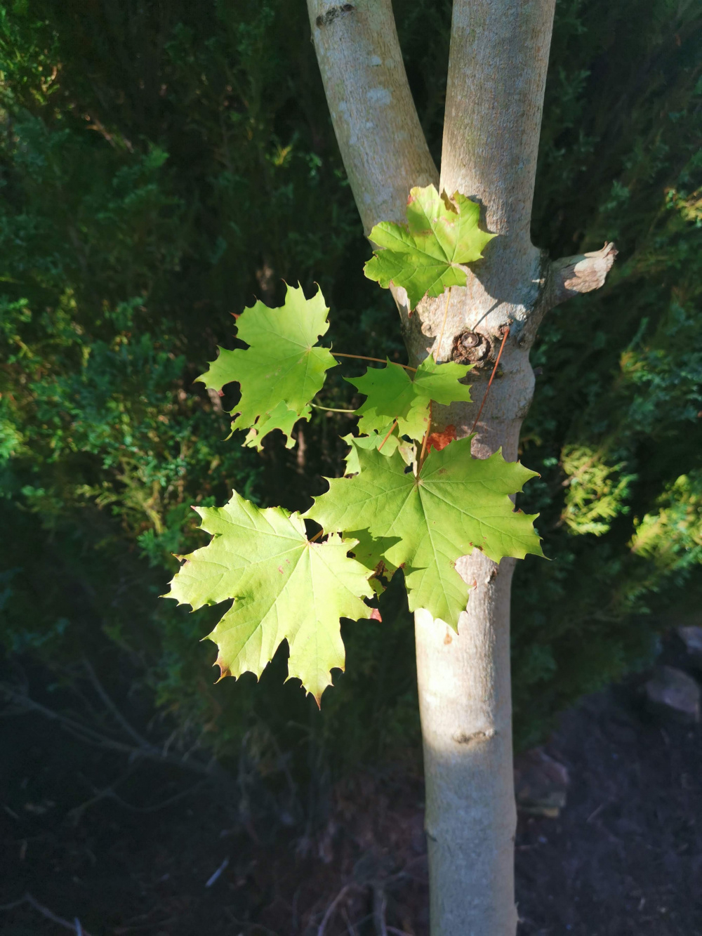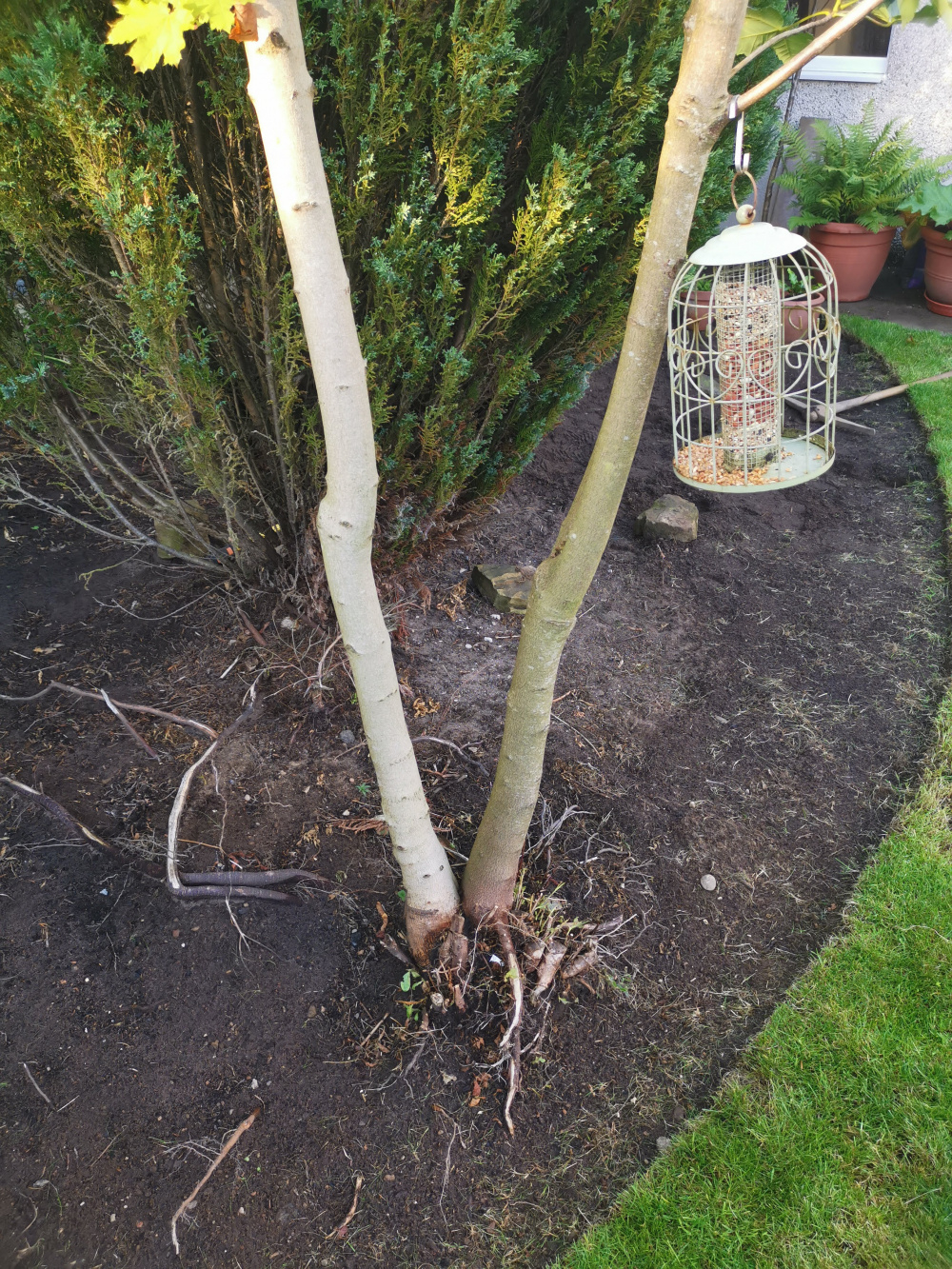 There are two different varieties of maple tree in our garden that have grown from the same spot in the ground and I am not sure what to do with them. I doubt they were planted this way intentionally. We have just started renovating the garden this year in our new house and we would like to try and keep some of the more mature trees and shrubs where possible, however, I am unsure if I should leave both trees as they are or remove one or both of them?