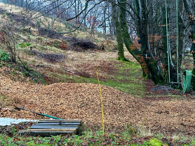 Thanks @Wilderbeast. That's good news. I have to rake it all to the bottom of the bank because the area will be covered in snowdrops in a week or two. They'll come through the thin layer of bark but not the thick. Would it help the rotting down process if I put a tarp over the chips and anchor it down?