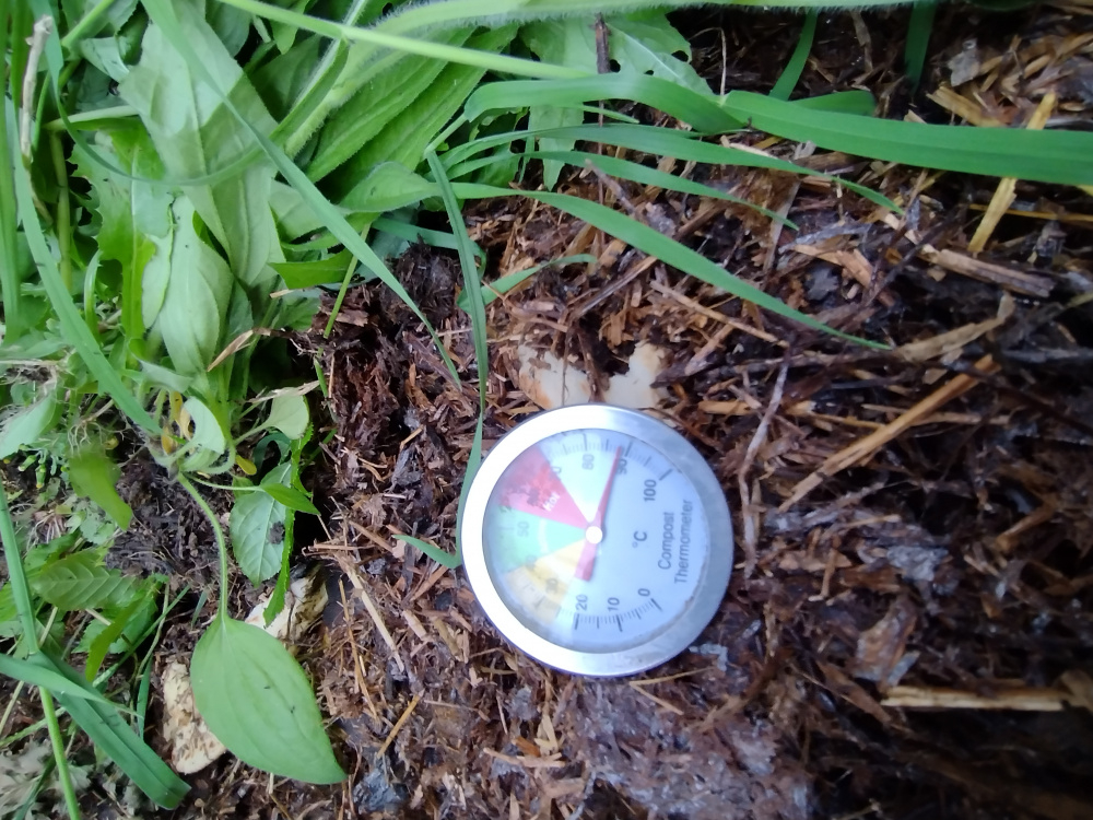 Mine's back up to 60°C after shredding down a load of Ribes prunings. Grass mowings alone seems to get it to around 50°C but some shredded woody stuff usually gets me to the desired 60°C.