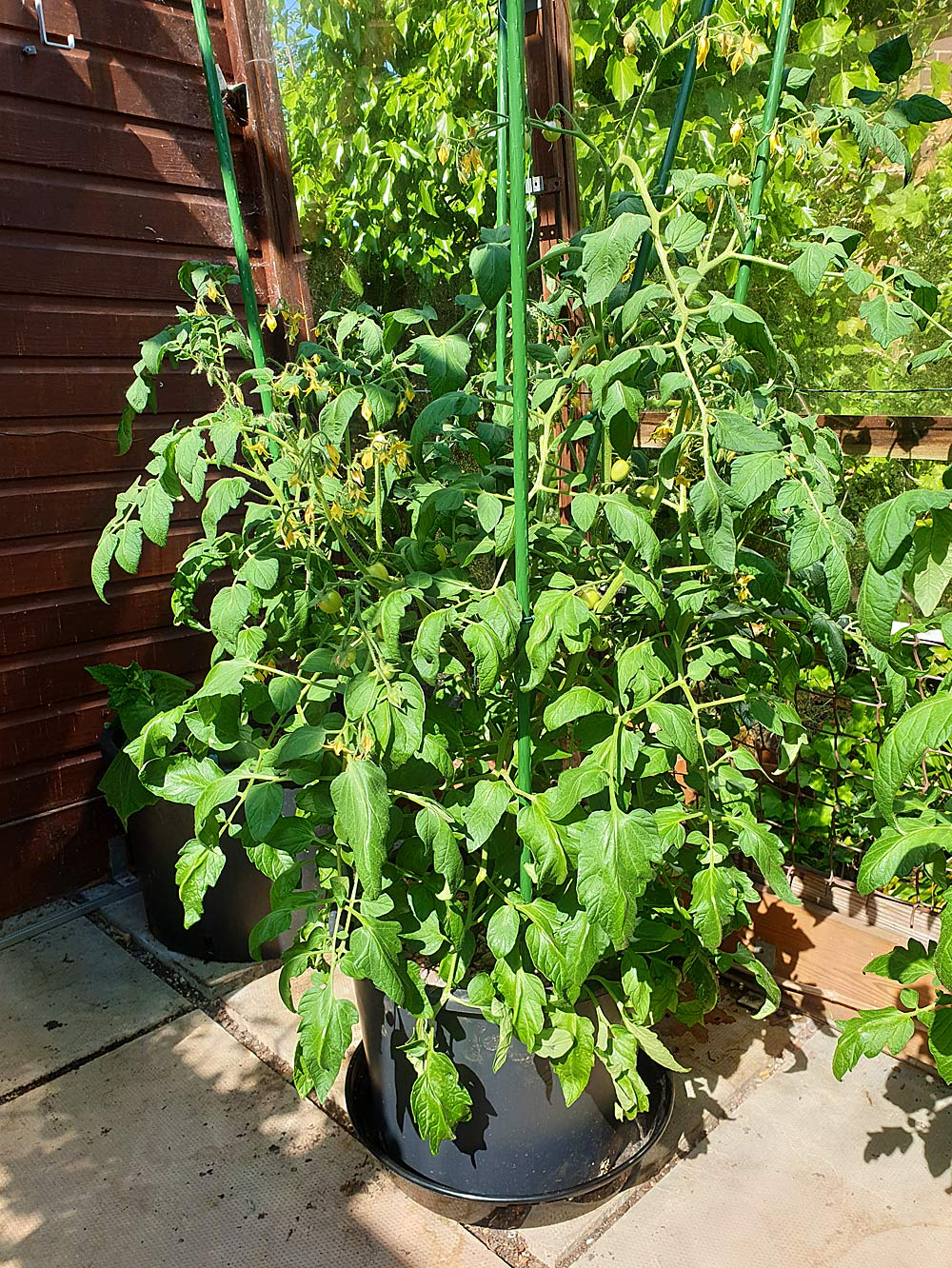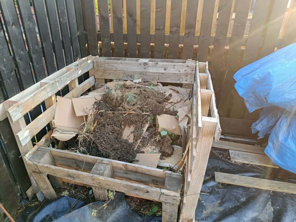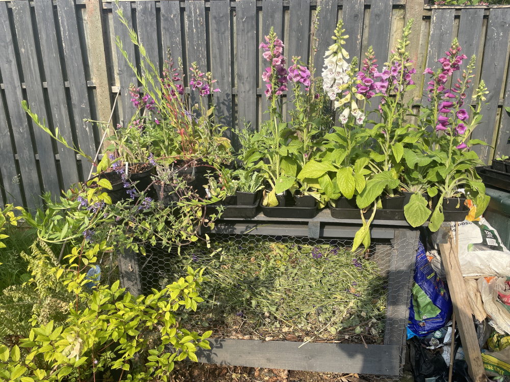 My compost bin is made from pallets, and I've laid a pallet on the top which enables me to use it as a workbench for storing potted plants that are either waiting to be planted out, or that I have no room for in my borders. I can side the trays of plants to one side to drop stuff through the slats into the compost heap...