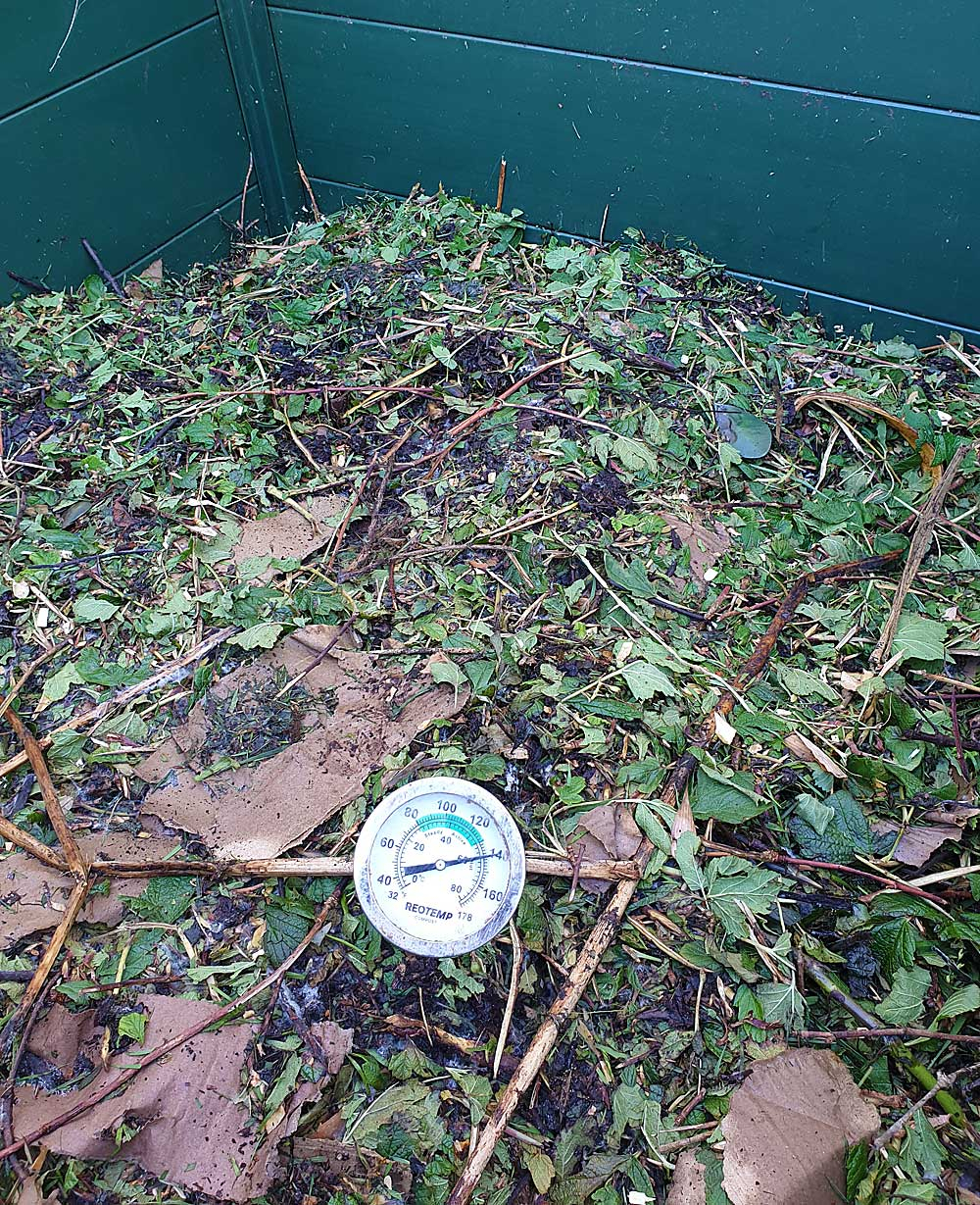 The newest bin which is very hot and has a very high grass content, needs turning every 4-5 days