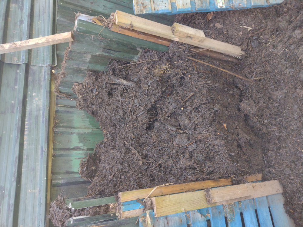 An update on my compost production 2 month old stuff that's coming along nicely The newest bin which is very hot and has a very high grass content, needs turning every 4-5 days The last bay from last year this is going on the veg beds bere pumpkins and sweet corn go out